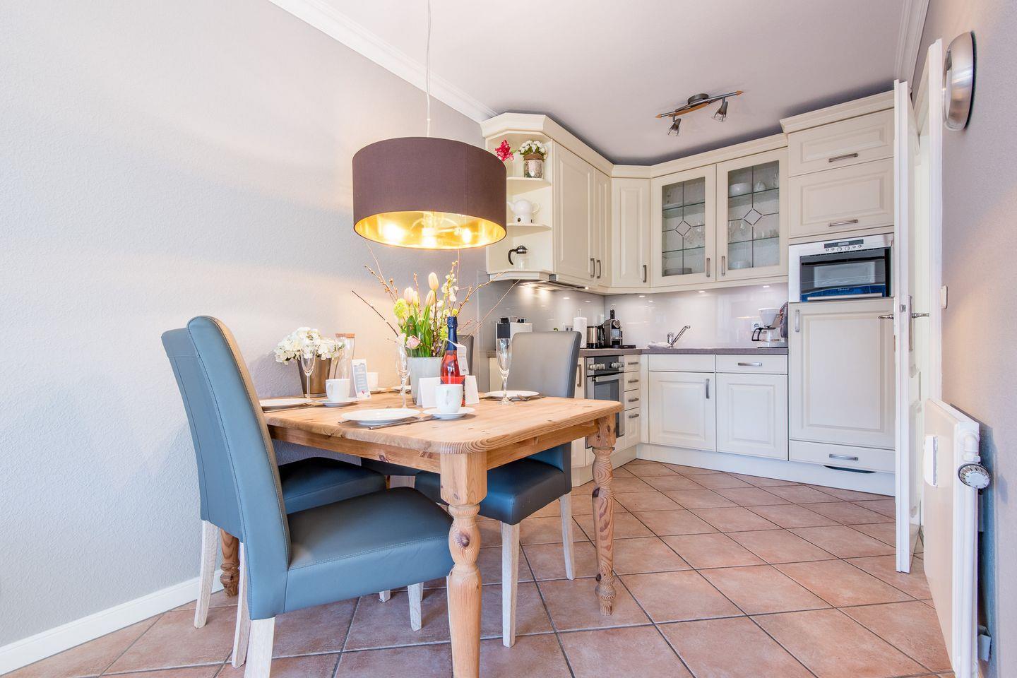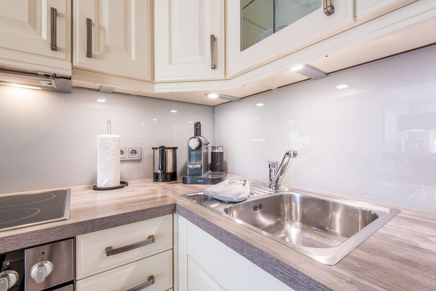 Die moderne Küche ist offen gestaltet und bietet alles, was Sie für die Zubereitung Ihrer Lieblingsgerichte benötigen. Sie ist mit einer Spülmaschine, einem Ceran-Kochfeld, einer Nespresso-Maschine, einer Mikrowelle und weiteren Annehmlichkeiten ausgestattet, die einen komfortablen Aufenthalt sicherstellen.