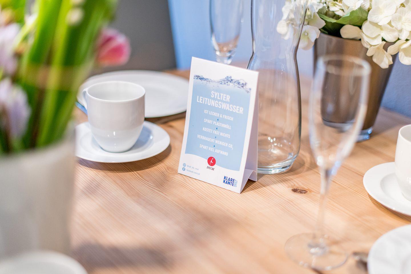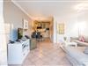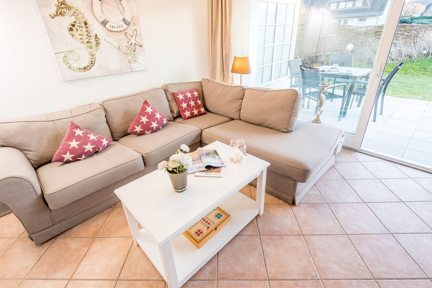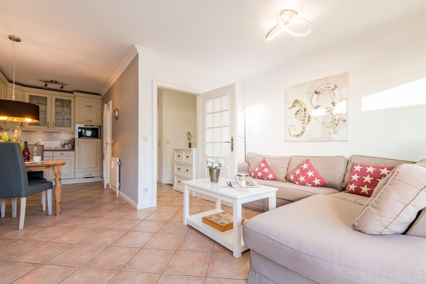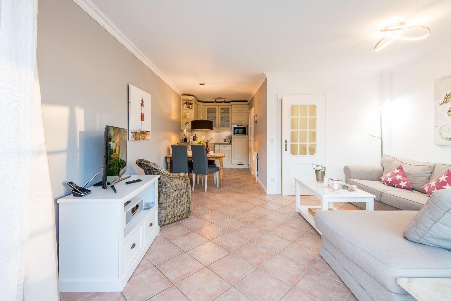 Der lichtdurchflutete Wohnbereich ist mit einer gemütlichen Sitzgarnitur, einem TV und einer SONOS Stereoanlage mit ausgestattet – ideal, um nach einem Strandtag zu entspannen. Ein Esstisch für 4 Personen bietet genügend Platz für gemeinsame Mahlzeiten. Von hier aus haben Sie direkten Zugang zur möblierten Südterrasse, wo Sie die Sonne und frische Luft in vollen Zügen genießen können.