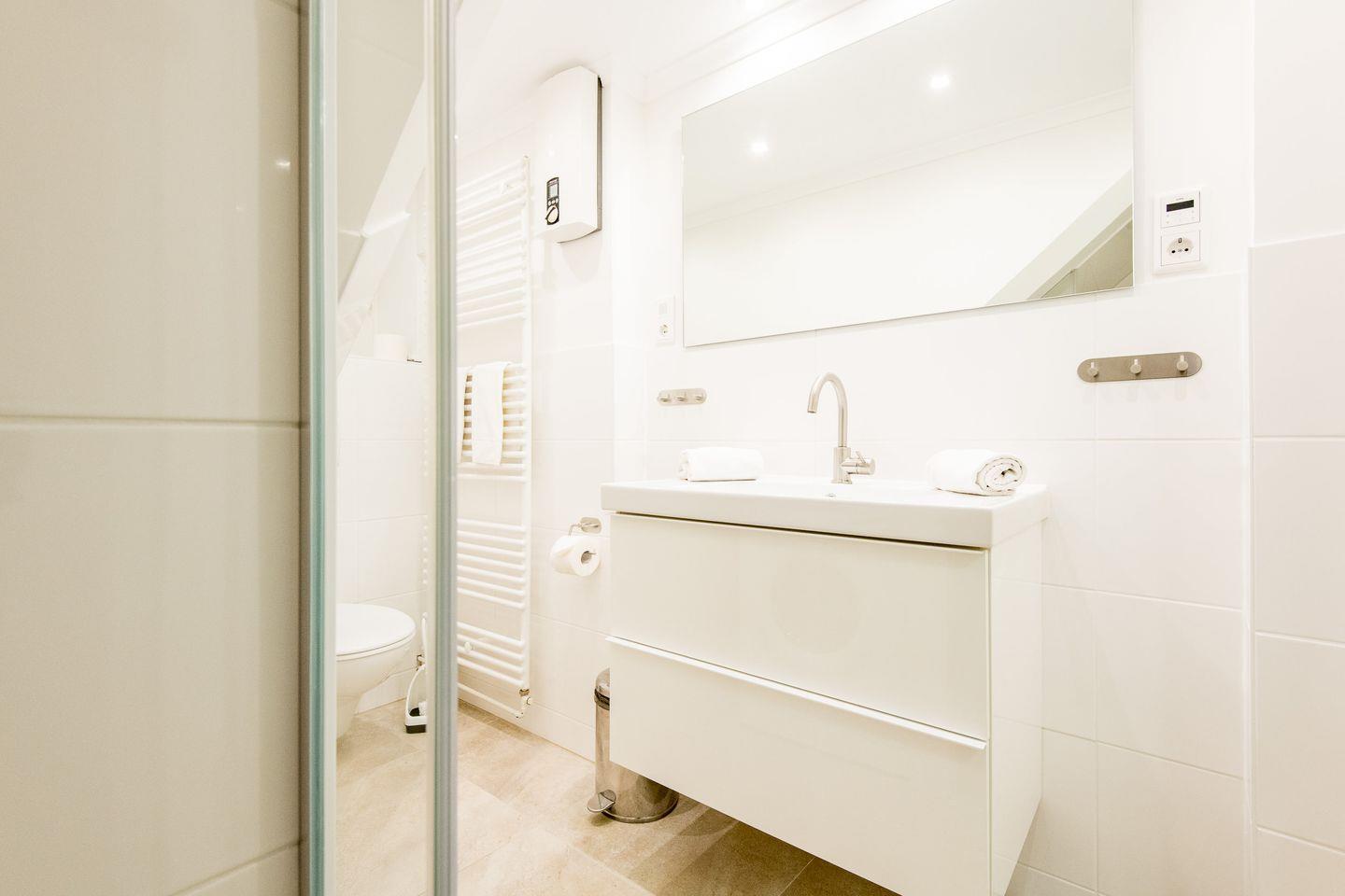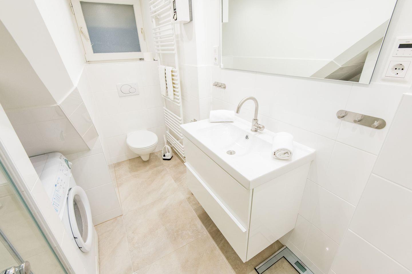 Das Badezimmer ist stilvoll ausgestattet und verfügt über eine Dusche, WC, Waschtisch und Handtuchwärmer. Eine Waschmaschine ist ebenfalls vorhanden und rundet die Ausstattung für Ihren Aufenthalt ab.