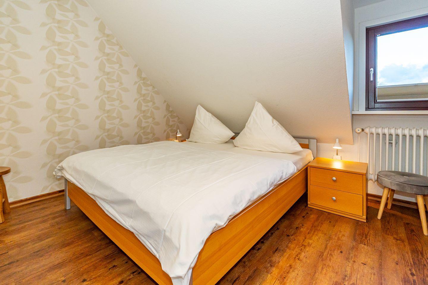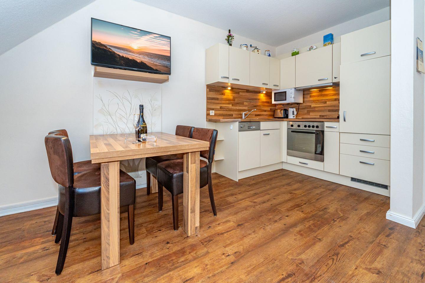 Die Ferienwohnung ist im Ober- und Dachgeschoss gelegen und verfügt über einen sonnigen Südbalkon. Der Wohn- und Essbereich mit einer offenen Küche befindet sich im OG. Die offene Küche ist mit Ceranfeld, Backofen, Mikrowelle, Kaffeemaschine, Geschirrspüler, Wasserkocher, Toaster und einem Kühlschrank mit Gefrierfach ausgestattet. Im OG befindet sich ebenfalls das Duschbad und ein Schlafzimmer mit Doppelbett. Über eine schmale Treppe gelangt man in das offene Dachgeschoß.