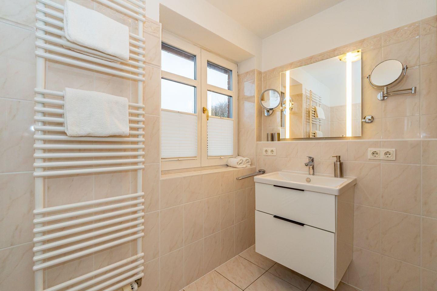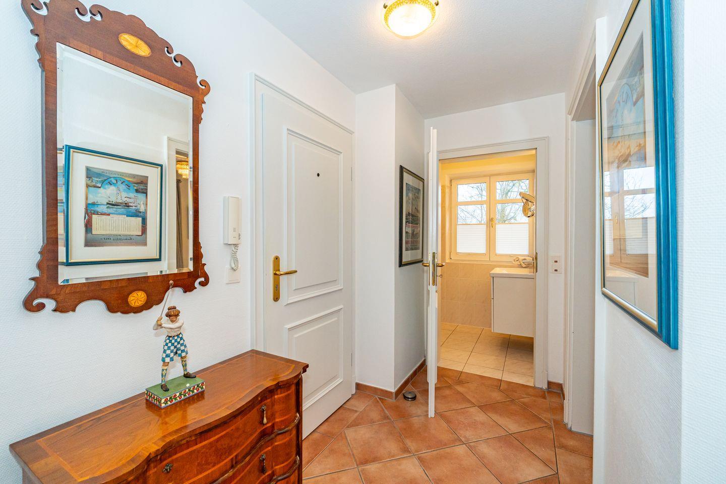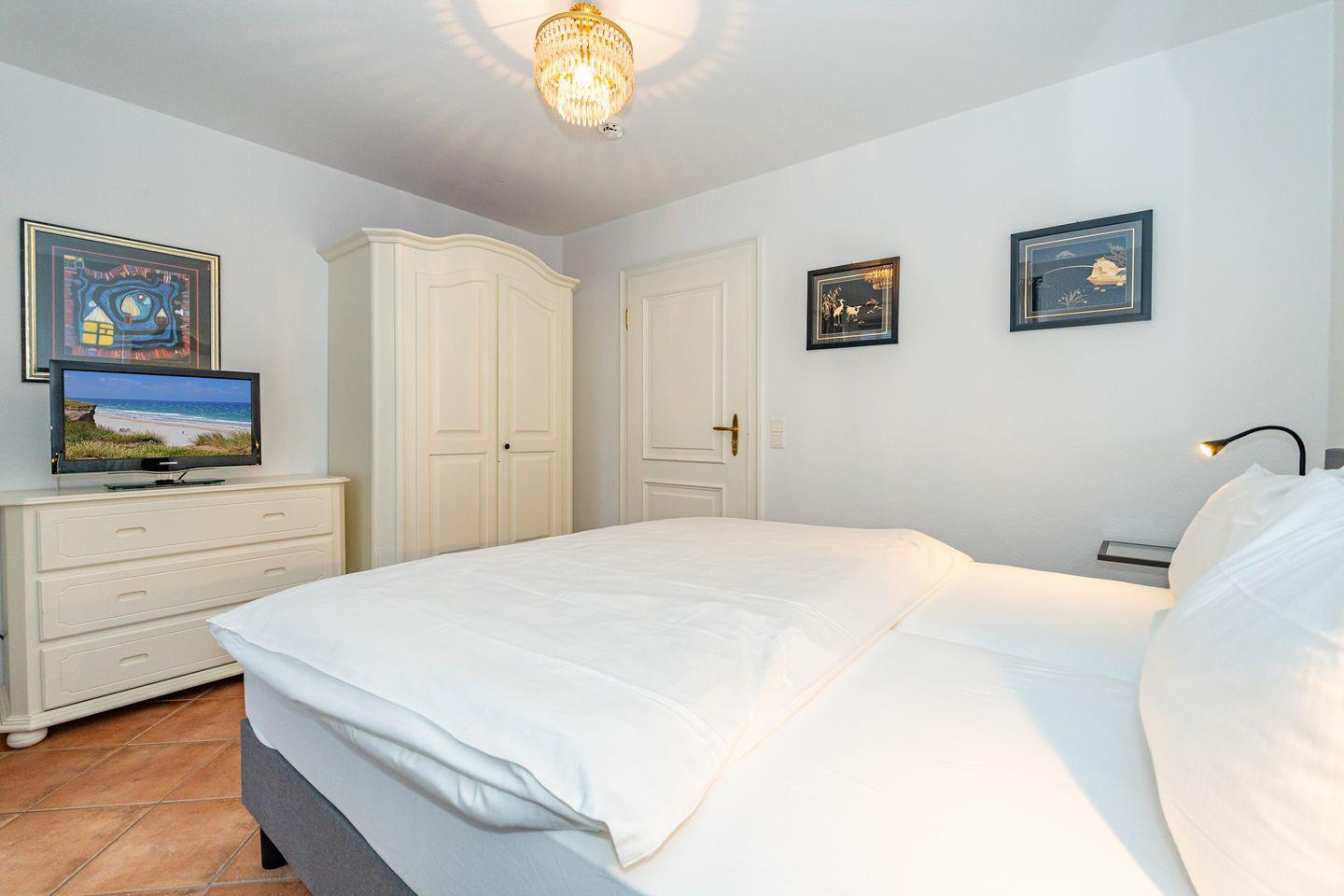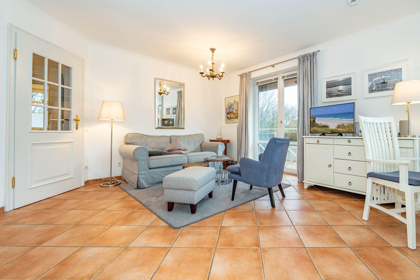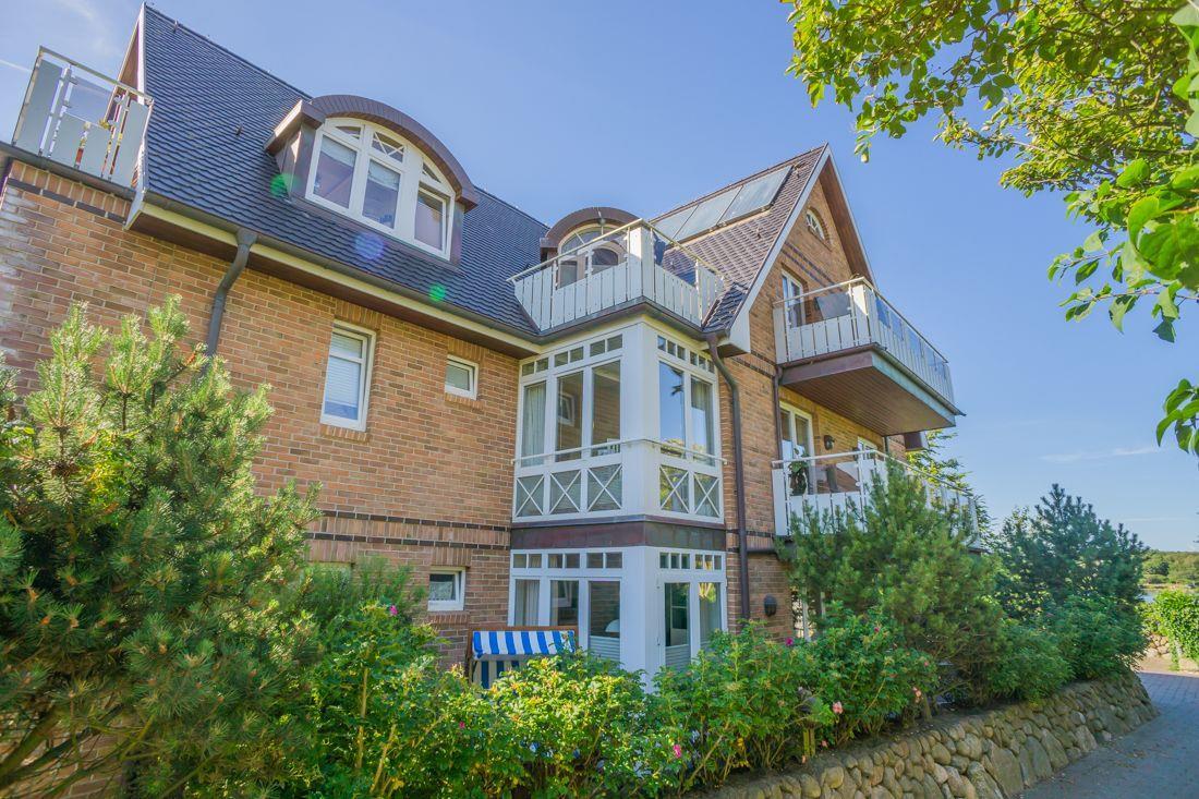 Eine zentral und dennoch ruhig gelegene Ferienwohnung am Wenningstedter Dorfteich. Der Wohnbereich der Ferienwohnung im 1. OG überzeugt mit seinem gemütlichem Sofa und Sessel, sowie Flat-TV. Er geht direkt über in den Essbereich in einem südlich ausgerichteten Glaserker, welcher perfekt geeignet ist, den Tag bei einem entspannten Frühstück zu beginnen. Die daneben liegende offene Küchenzeile bietet von einer Mikrowelle, über einen Backofen, bis hin zum Geschirrspüler alles, was man braucht. Vom Wohnbereich aus haben Sie Zutritt zum östlich ausgerichteten Balkon. Das Schlafzimmer bietet neben dem komfortablen Doppelbett genug Schrankfläche und ebenfalls Zutritt zum Balkon. Von dort aus haben Sie einen wunderschönen seitlichen Blick auf den Wenningstedter Dorfteich und die sehenswerte Friesenkapelle. Das Duschbad mit WC und Handtuchheizung ist lichtdurchflutet und komfortabel. Im Wohnzimmer steht ein weiterer Doppelschrankbett mit weiterem Stauraum bereit.