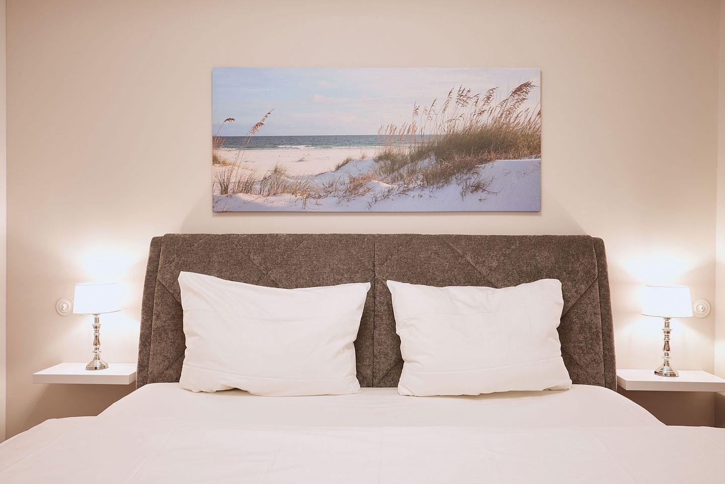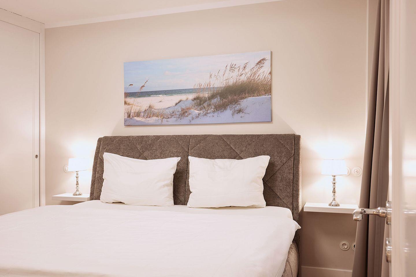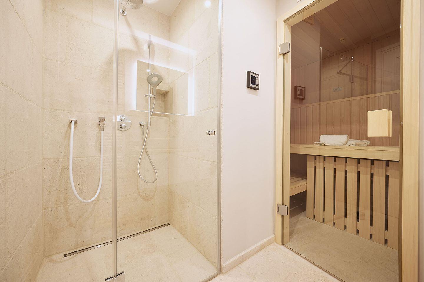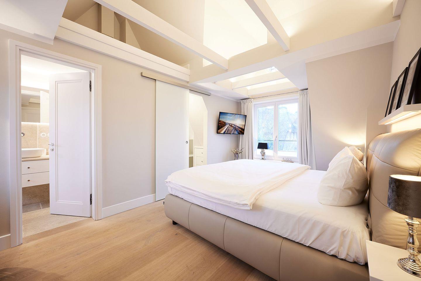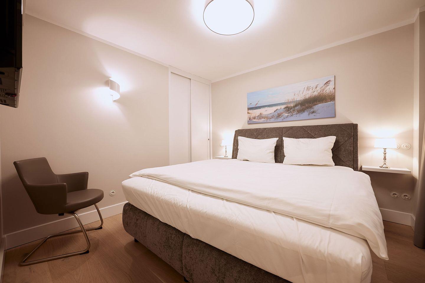 Die drei Schlafzimmer bieten höchsten Schlafkomfort. Zwei der Schlafzimmer sind mit luxuriösen Boxspring-Doppelbetten (180x200 cm), eingebauten Kleiderschränken und einem TV ausgestattet. Beide Schlafzimmer verfügen zudem über ein angrenzendes Badezimmer mit ebenerdiger Dusche, Fußbodenheizung, Tageslicht und einem Föhn – ideal für erholsame Nächte und einen entspannten Start in den Tag. Das dritte Schlafzimmer, ebenfalls mit einem Boxspring-Doppelbett (180x200 cm), bietet zusätzlichen Platz und Komfort.