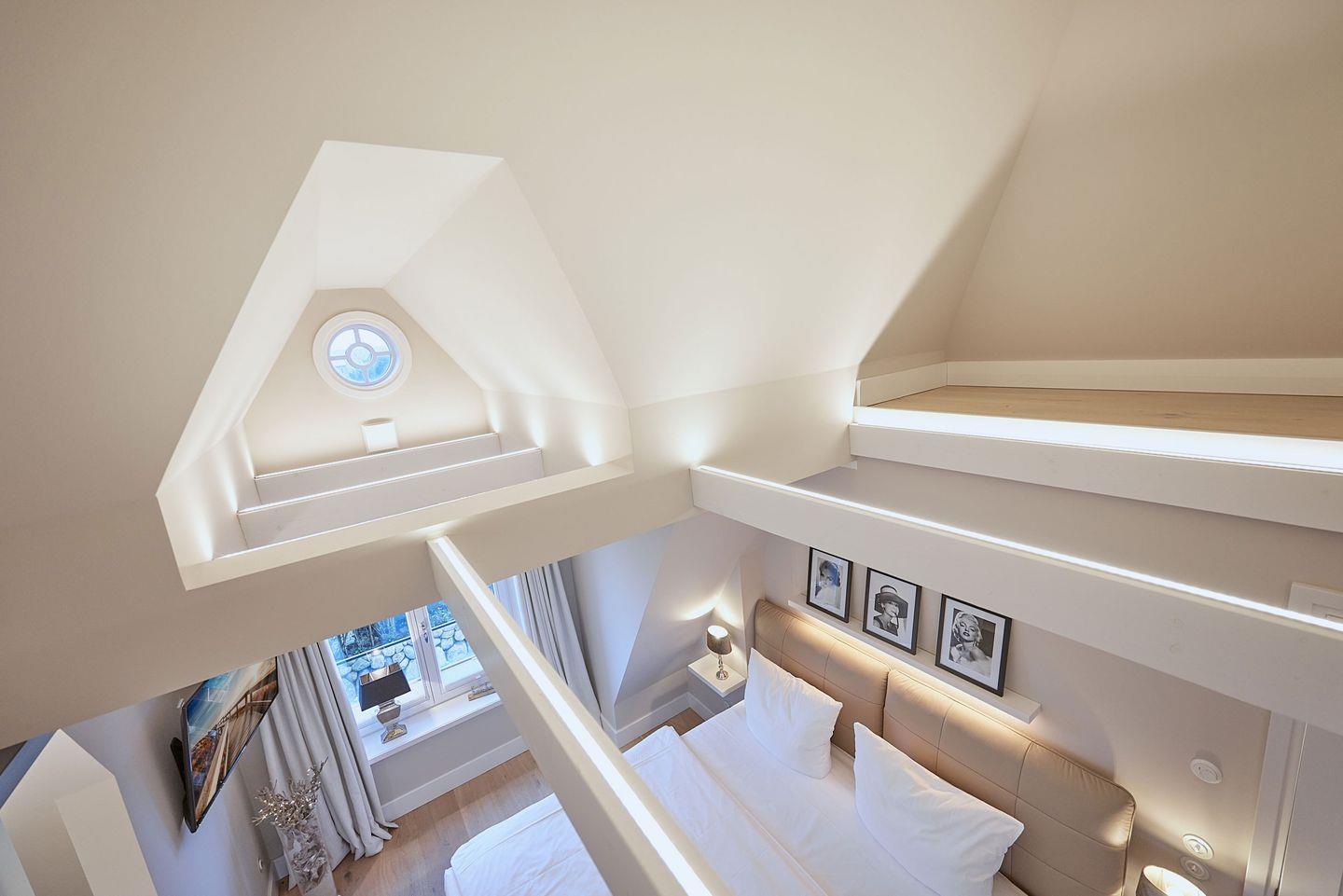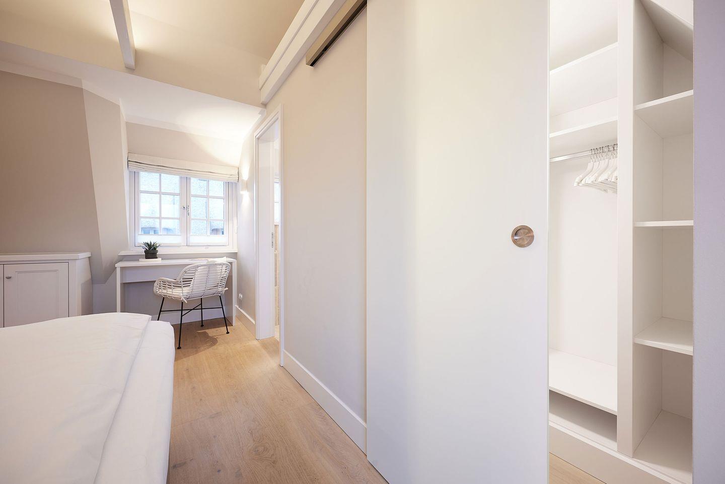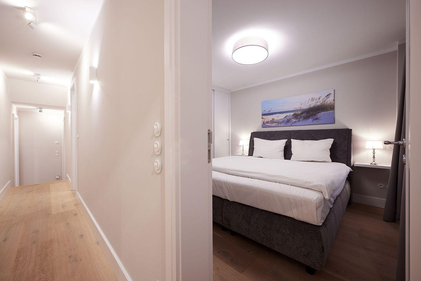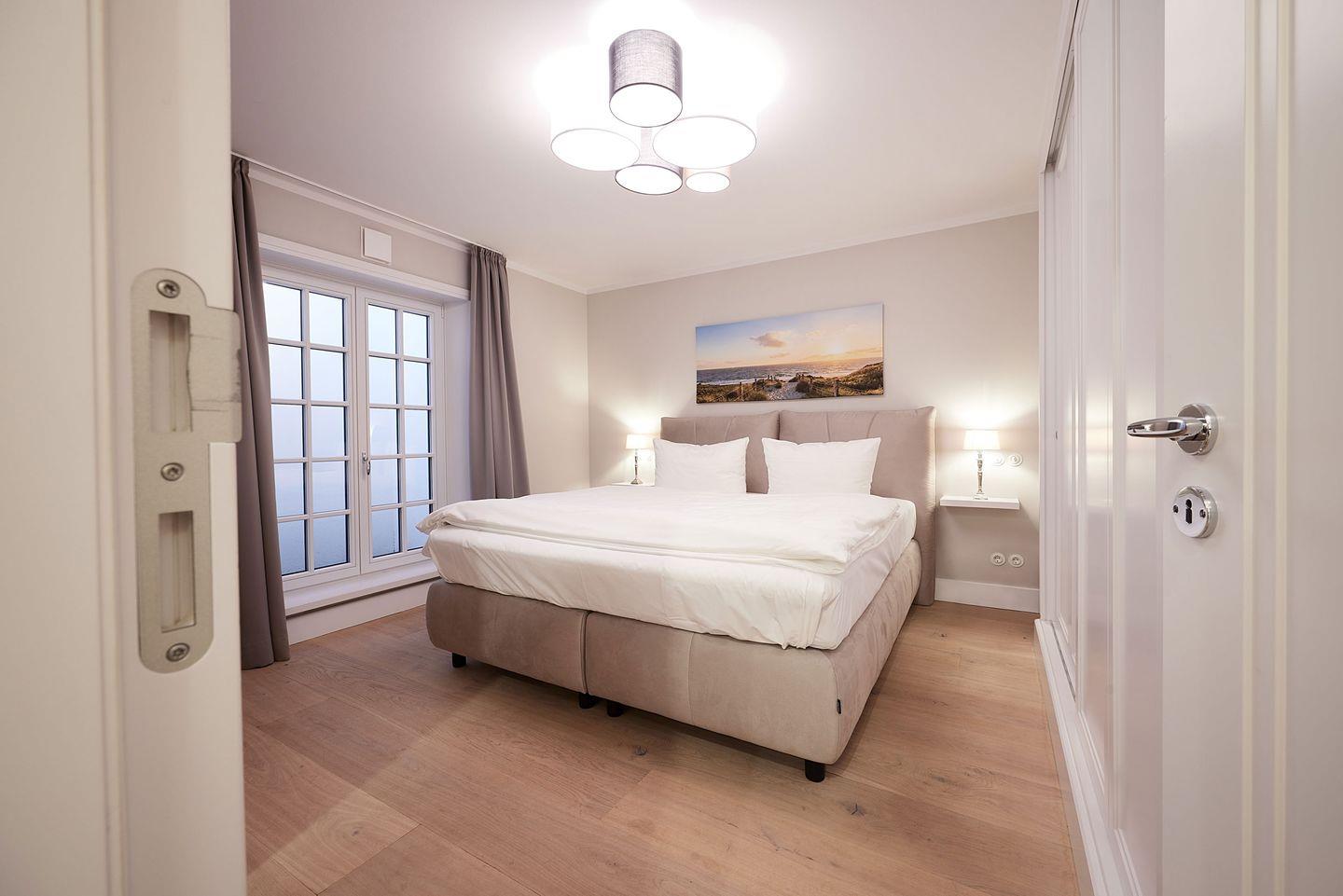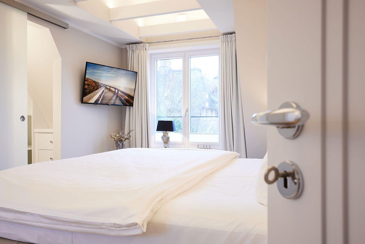 Die drei Schlafzimmer bieten höchsten Schlafkomfort. Zwei der Schlafzimmer sind mit luxuriösen Boxspring-Doppelbetten (180x200 cm), eingebauten Kleiderschränken und einem TV ausgestattet. Beide Schlafzimmer verfügen zudem über ein angrenzendes Badezimmer mit ebenerdiger Dusche, Fußbodenheizung, Tageslicht und einem Föhn – ideal für erholsame Nächte und einen entspannten Start in den Tag. Das dritte Schlafzimmer, ebenfalls mit einem Boxspring-Doppelbett (180x200 cm), bietet zusätzlichen Platz und Komfort.