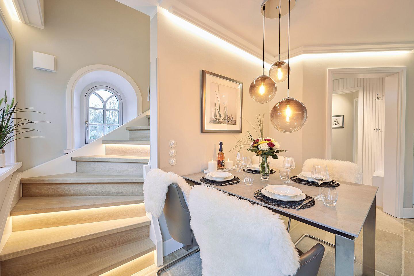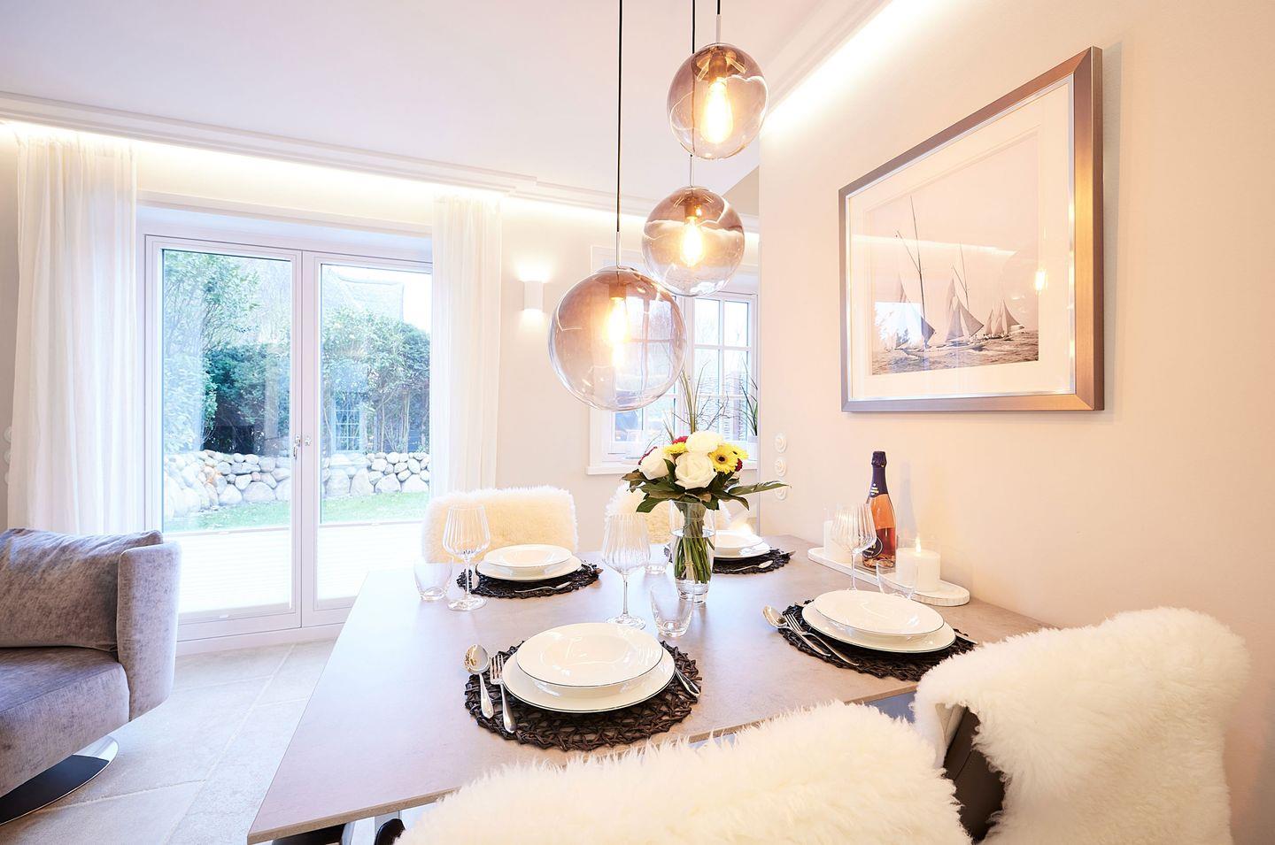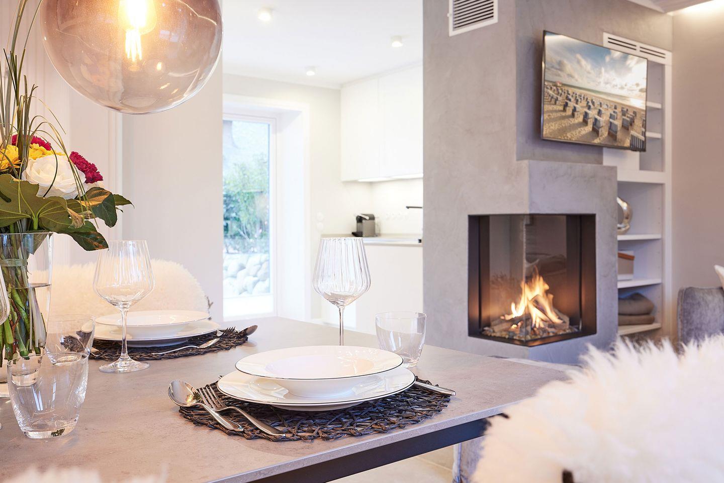 Das lichtdurchflutete Wohn- und Esszimmer verführt mit einem gemütlichen Gaskamin und einer stilvollen Couch – der perfekte Ort, um nach einem Tag am Strand zu entspannen. Von hier aus gelangen Sie direkt in den Garten und auf zwei Terrassen, die mit Gartenmöbeln ausgestattet sind. Diese bieten Ihnen ausreichend Platz, um im Freien zu entspannen oder gesellige Grillabende zu genießen. Der Esstisch, direkt neben dem Kamin, lädt zu langen, gemütlichen Abenden ein.