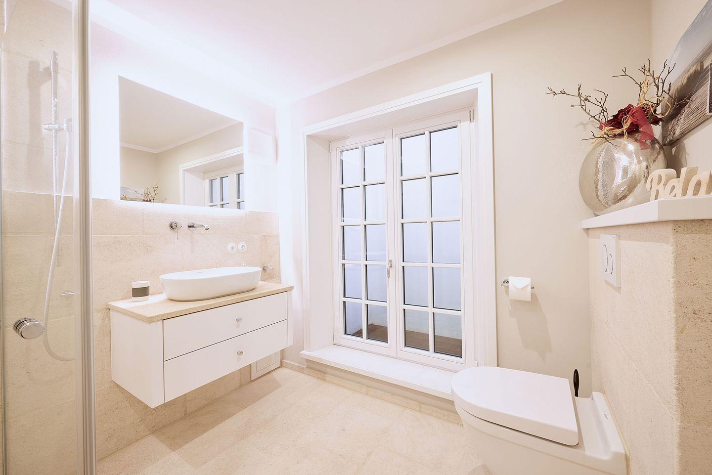Die beiden modernen Duschbäder sind mit hochwertigen Materialien ausgestattet und bieten Fußbodenheizung sowie Tageslicht.