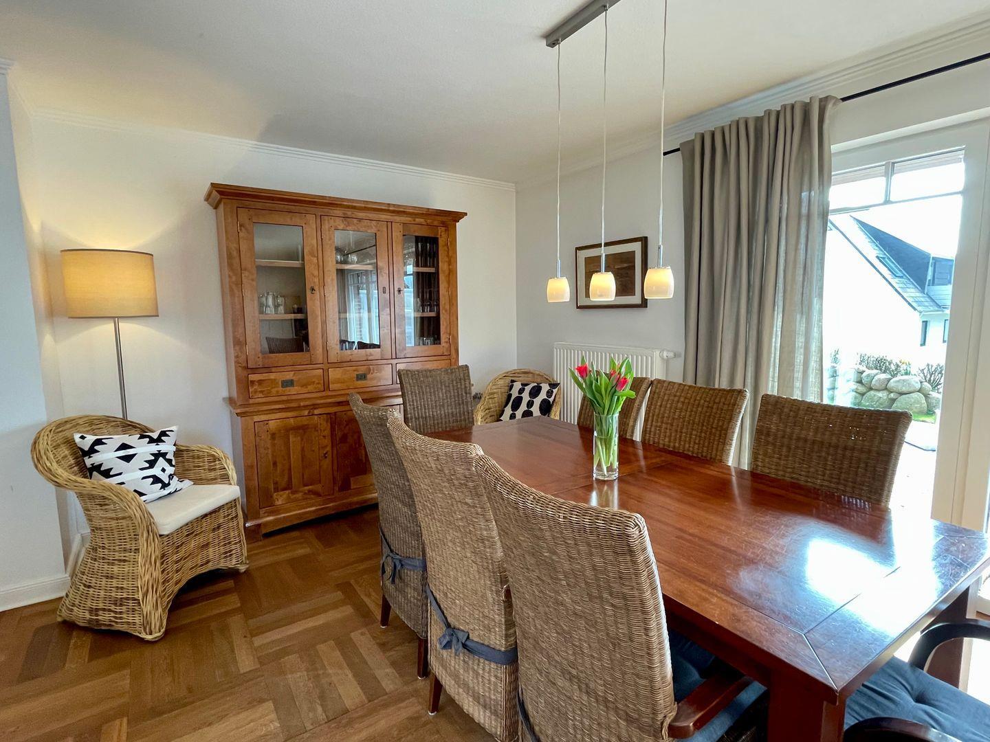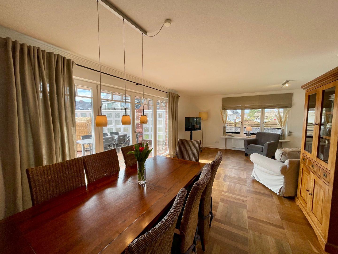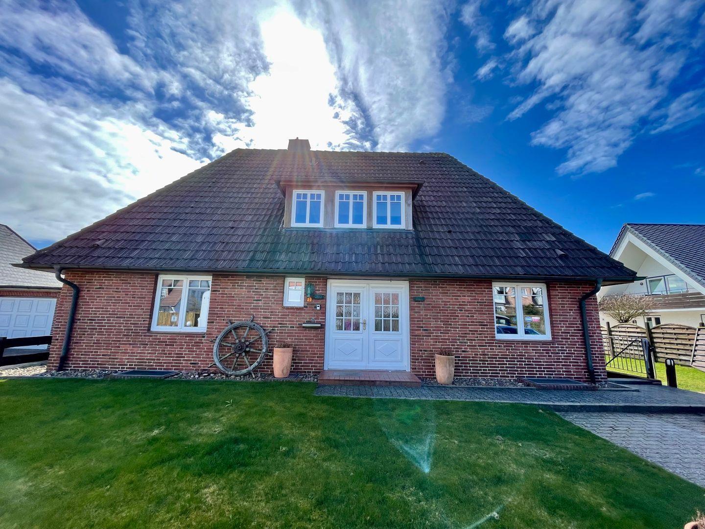 Dieses großzügige Haus präsentiert sich im Landhausstil mit hochwertigen Materialien und warmen Farben. Das sehr große Wohnzimmer mit Parkettfußboden, Esstisch und gemütlicher Sitzgarnitur ist das Herzstück dieses Hauses. Angrenzend befindet sich dann die wind- und sichtgeschützte Terrasse mit eigenem Strandkorb und Gartenmöbeln. Im Erdgeschoss befindet sich ebenfalls die separate Küche, sowie ein Schlafzimmer mit Doppelbett und ein Schlafzimmer mit Einzelbett.