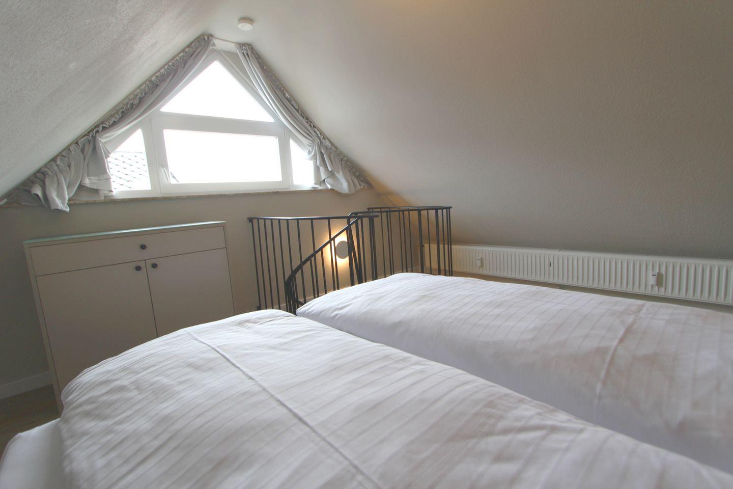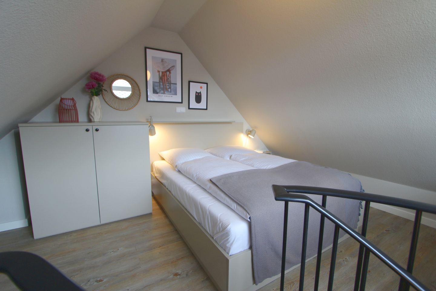 Der Schlafraum befindet sich im Dachgeschoss und bietet sowohl ein komfortables Doppelbett als auch geräumige Einbau-Schränke, in denen Sie Platz für das Reisegepäck finden. Die Wendeltreppe ins Dachgeschoss ist sehr eng!