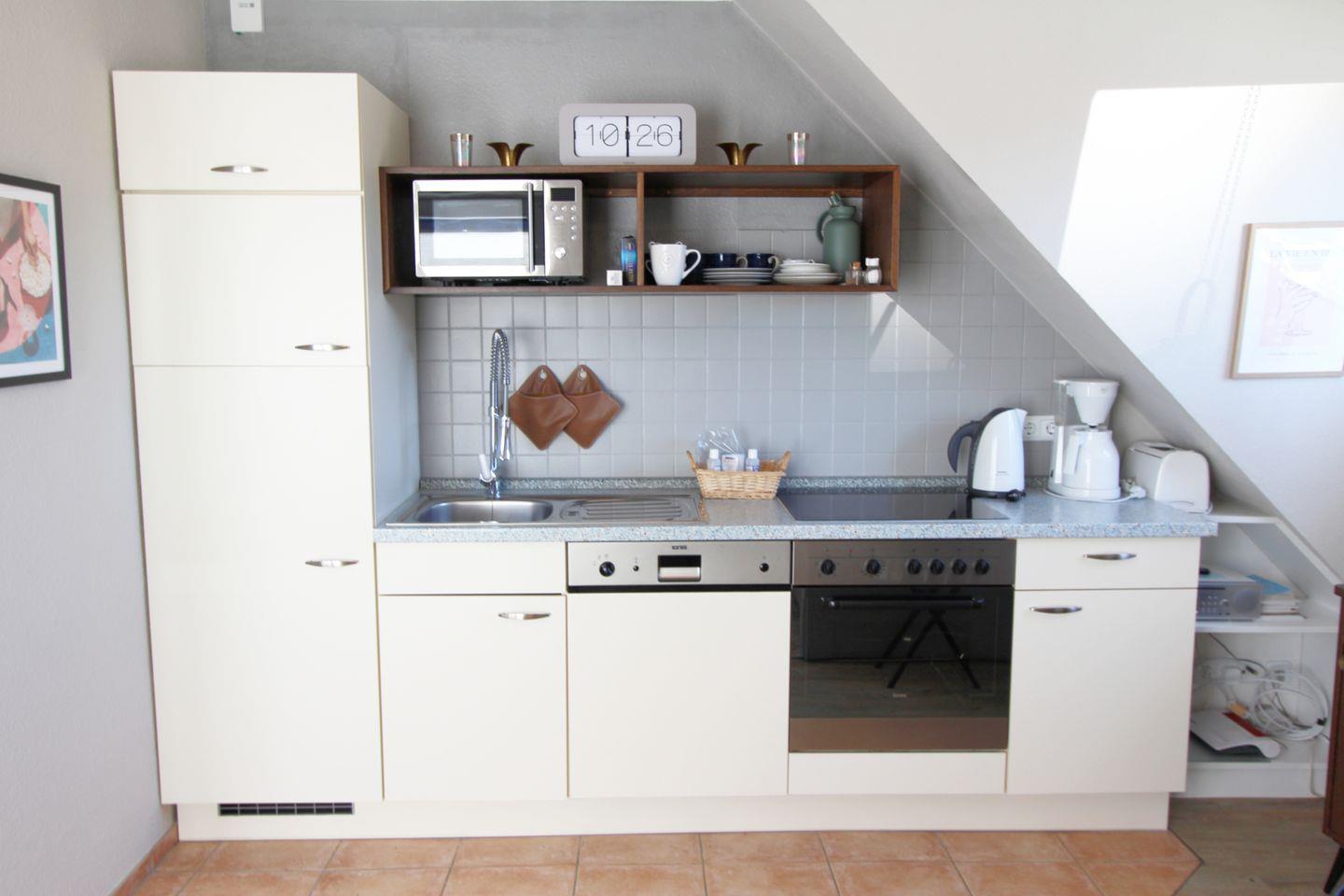 Die Küchenzeile grenzt offen an den Wohnbereich an und ist gut ausgestattet um sich kulinarisch zu verpflegen. Der Essensplatz befindet sich am bodentiefen Balkon-Fenster und ist schön hell.