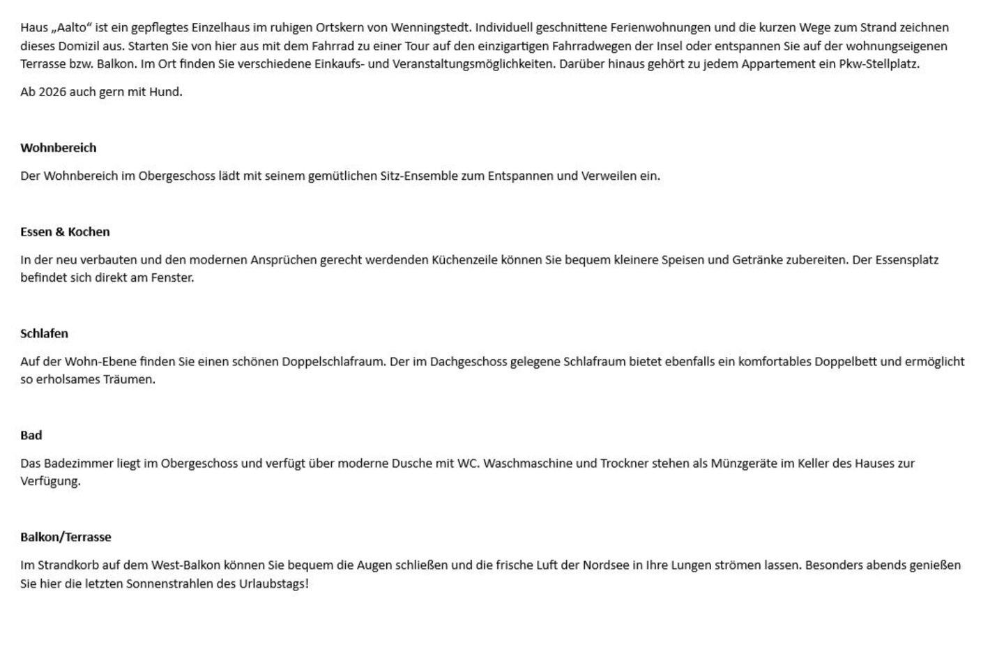Haus „Aalto“ ist ein gepflegtes Einzelhaus im ruhigen Ortskern von Wenningstedt. Individuell geschnittene Ferienwohnungen und die kurzen Wege zum Strand zeichnen dieses Domizil aus. Starten Sie von hier aus mit dem Fahrrad zu einer Tour auf den einzigartigen Fahrradwegen der Insel oder entspannen Sie auf der wohnungseigenen Terrasse bzw. Balkon. Im Ort finden Sie verschiedene Einkaufs- und Veranstaltungsmöglichkeiten. Darüber hinaus gehört zu jedem Appartement ein Pkw-Stellplatz.