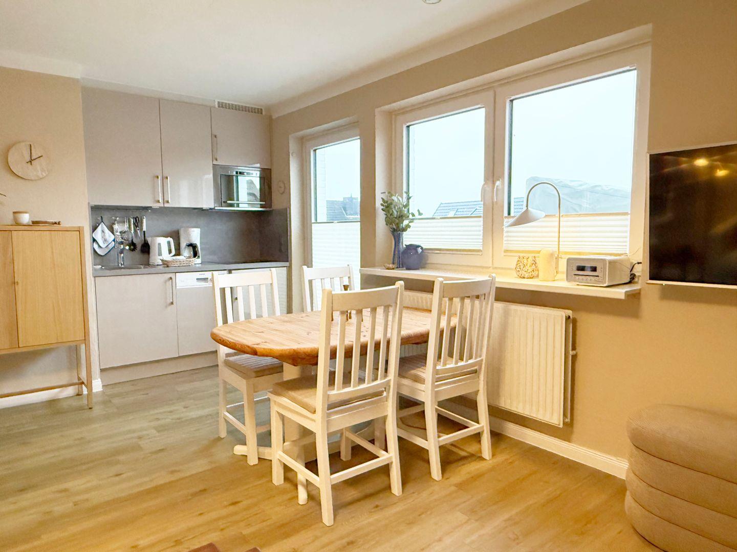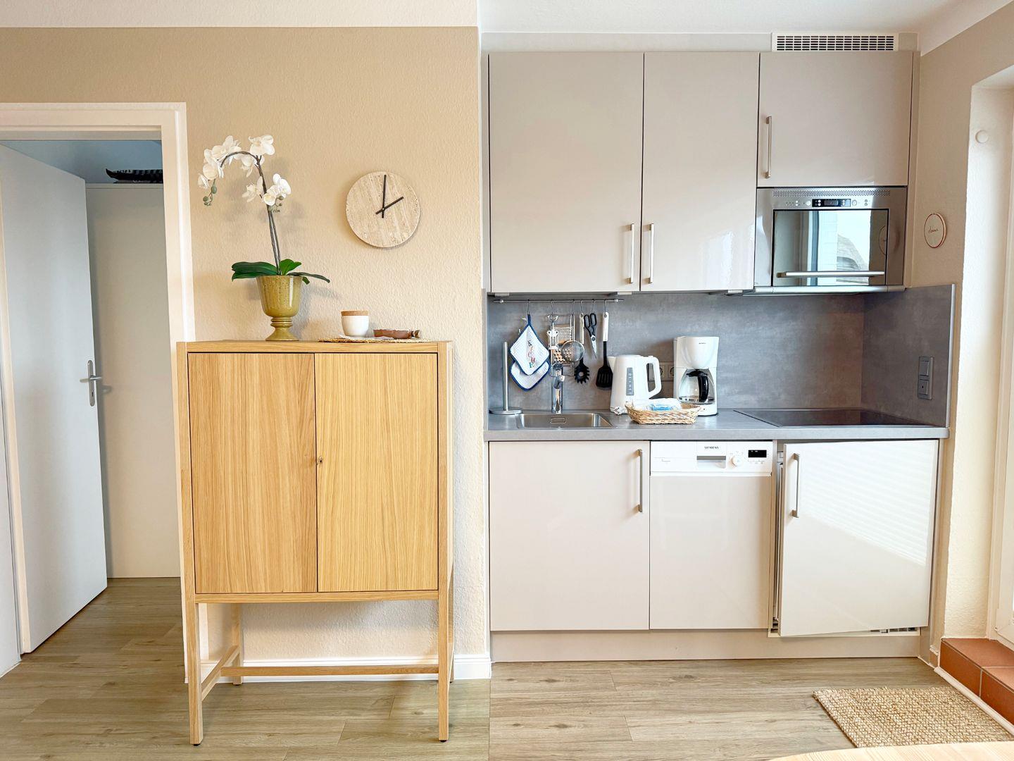 In der neu verbauten und den modernen Ansprüchen gerecht werdenden Küchenzeile können Sie bequem kleinere Speisen und Getränke zubereiten. Der Essensplatz befindet sich direkt am Fenster.