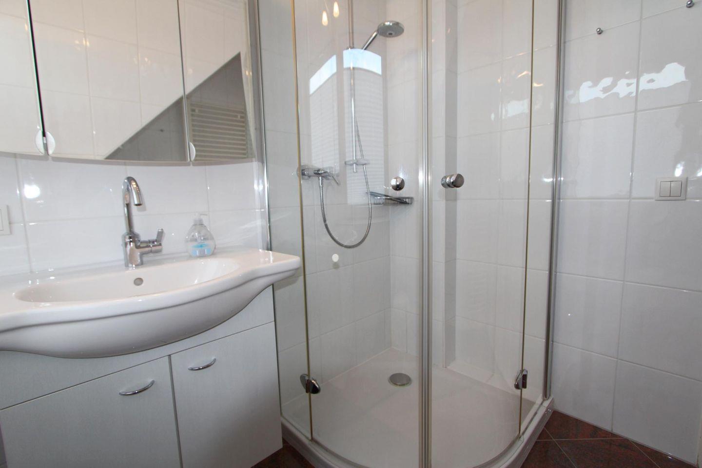Das Badezimmer liegt im Obergeschoss und verfügt über moderne Dusche mit WC. Waschmaschine und Trockner stehen als Münzgeräte im Keller des Hauses zur Verfügung.