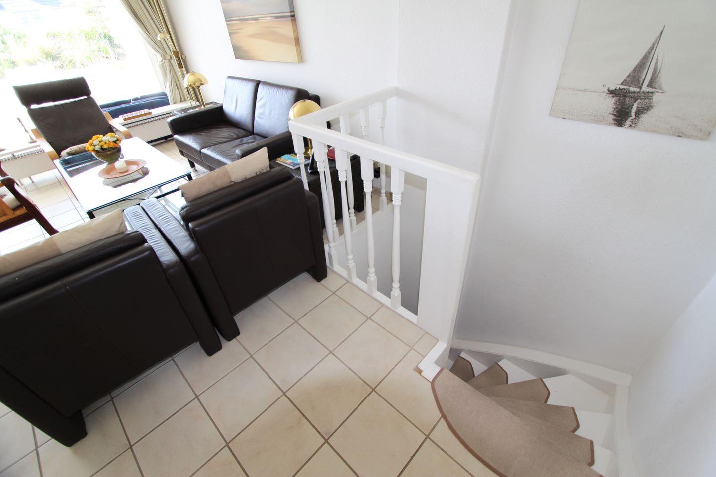 Ein stilvoller Wohnbereich im Erdgeschoss mit hochwertigem Mobiliar bildet das Herzstück dieses Ferienappartements. Lassen Sie bei einem Blick auf das grüne Gartenstück die Seele baumeln.
