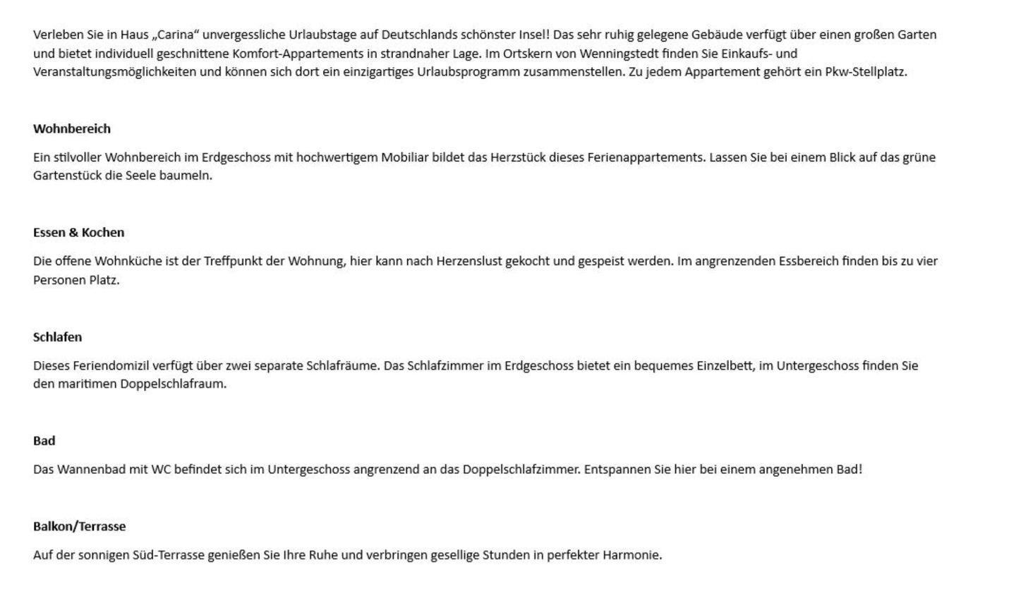 Verleben Sie in Haus „Carina“ unvergessliche Urlaubstage auf Deutschlands schönster Insel! Das sehr ruhig gelegene Gebäude verfügt über einen großen Garten und bietet individuell geschnittene Komfort-Appartements in strandnaher Lage. Im Ortskern von Wenningstedt finden Sie Einkaufs- und Veranstaltungsmöglichkeiten und können sich dort ein einzigartiges Urlaubsprogramm zusammenstellen. Zu jedem Appartement gehört ein Pkw-Stellplatz.