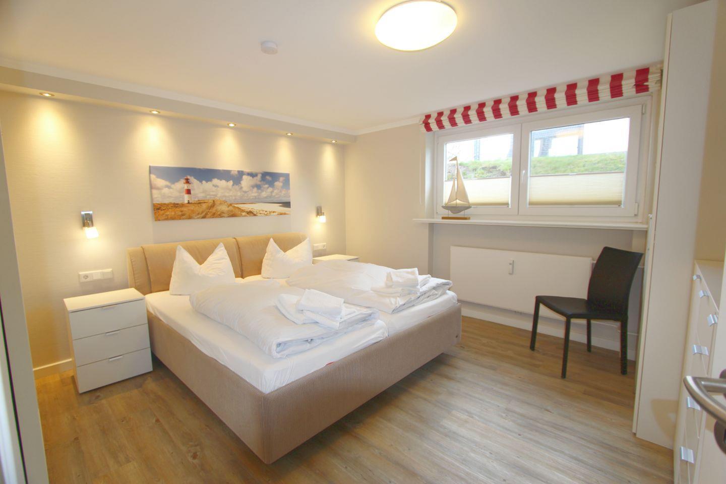 Im Erdgeschoss finden Sie ein Kinderschlafzimmer mit Schlafsofa (max. ein Erwachsener). Das Elternschlafzimmer befindet sich im Untergeschoss, welches ausgeschachtet ist und Tageslicht mit Blick auf den Rasen bietet.