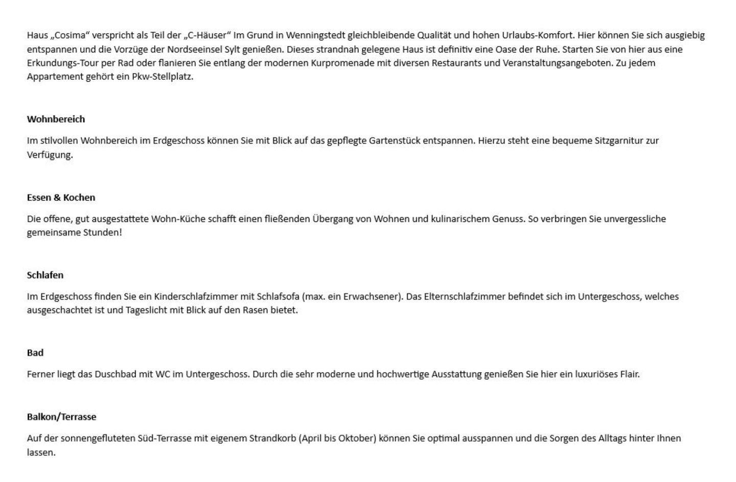 Haus „Cosima“ verspricht als Teil der „C-Häuser“ Im Grund in Wenningstedt gleichbleibende Qualität und hohen Urlaubs-Komfort. Hier können Sie sich ausgiebig entspannen und die Vorzüge der Nordseeinsel Sylt genießen. Dieses strandnah gelegene Haus ist definitiv eine Oase der Ruhe. Starten Sie von hier aus eine Erkundungs-Tour per Rad oder flanieren Sie entlang der modernen Kurpromenade mit diversen Restaurants und Veranstaltungsangeboten. Zu jedem Appartement gehört ein Pkw-Stellplatz.