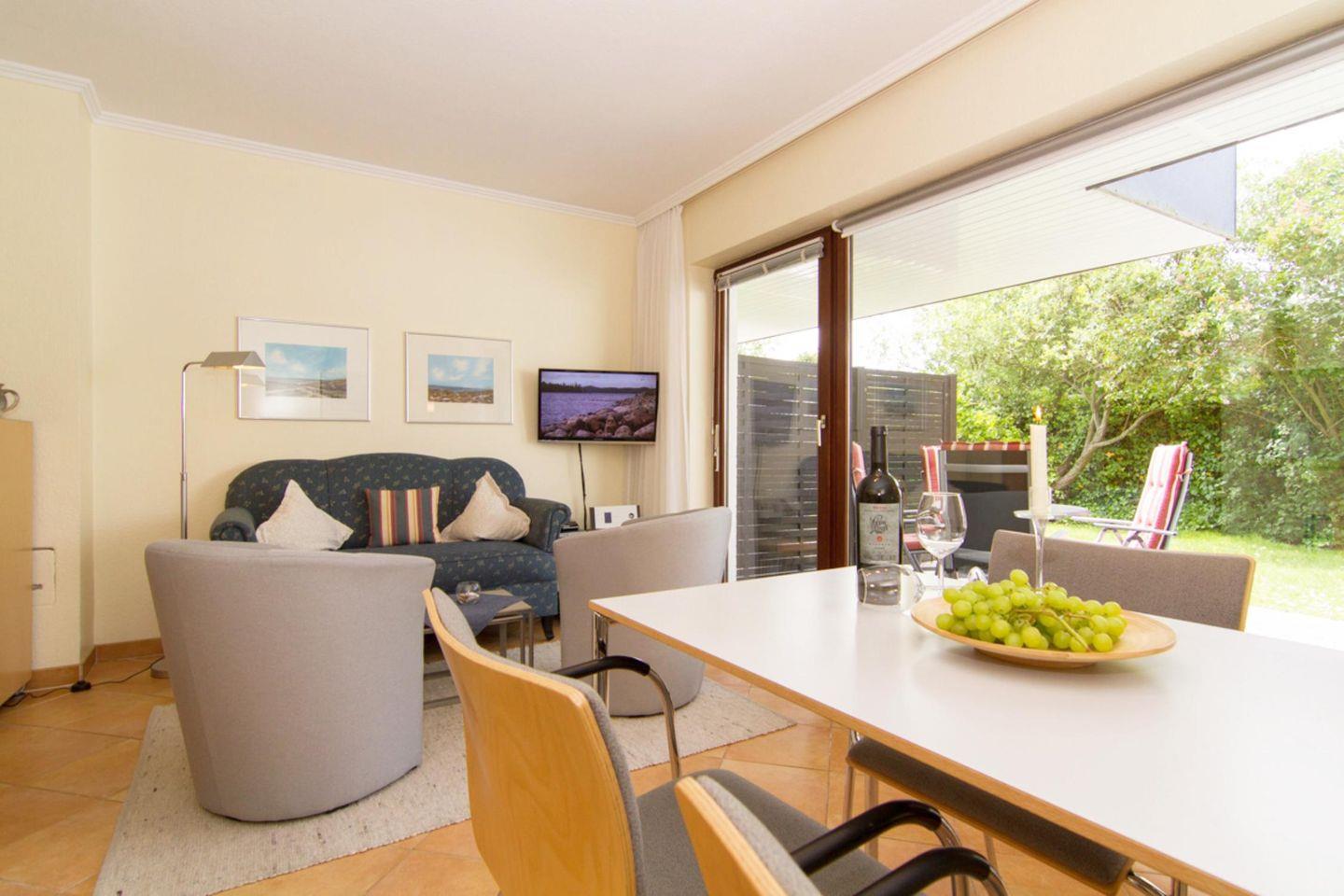 Auf der sonnigen West-Terrasse mit kleinem Gartenstück verbringen Sie wundervolle Stunden und können es sich im inseltypischen Strandkorb (April bis Oktober) gut gehen lassen.