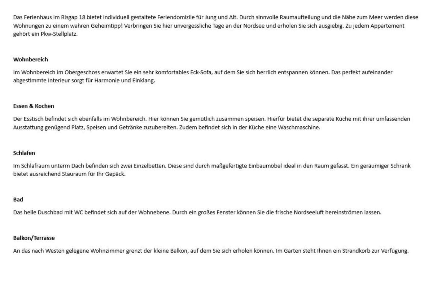 Das Ferienhaus im Risgap 18 bietet individuell gestaltete Feriendomizile für Jung und Alt. Durch sinnvolle Raumaufteilung und die Nähe zum Meer werden diese Wohnungen zu einem wahren Geheimtipp! Verbringen Sie hier unvergessliche Tage an der Nordsee und erholen Sie sich ausgiebig. Zu jedem Appartement gehört ein Pkw-Stellplatz.