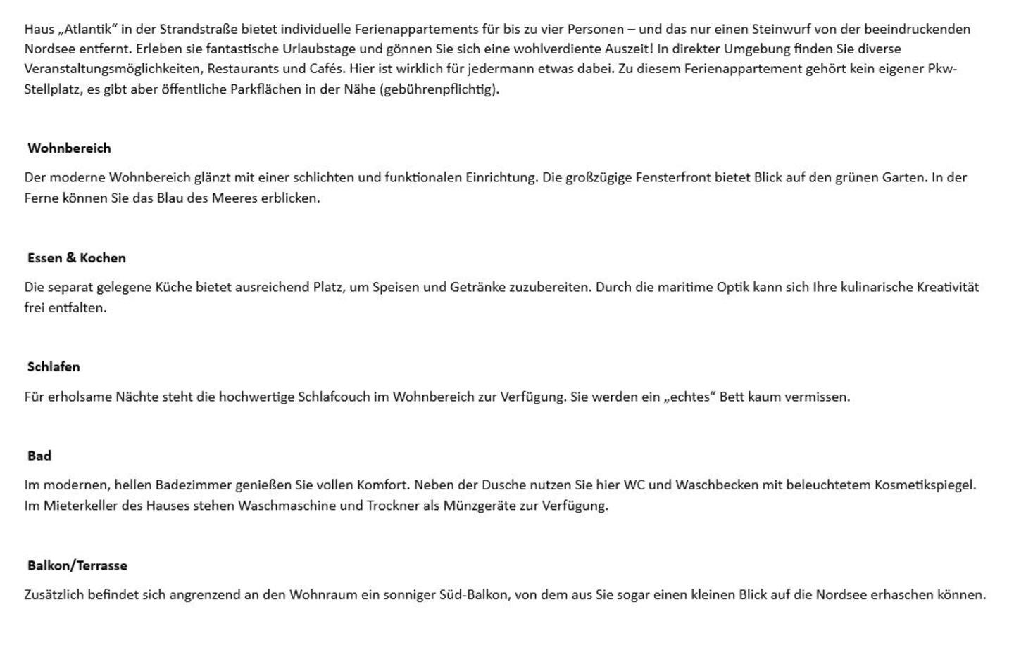 Haus „Atlantik“ in der Strandstraße bietet individuelle Ferienappartements für bis zu vier Personen – und das nur einen Steinwurf von der beeindruckenden Nordsee entfernt. Erleben sie fantastische Urlaubstage und gönnen Sie sich eine wohlverdiente Auszeit! In direkter Umgebung finden Sie diverse Veranstaltungsmöglichkeiten, Restaurants und Cafés. Hier ist wirklich für jedermann etwas dabei. Zu diesem Ferienappartement gehört kein eigener Pkw-Stellplatz, es gibt aber öffentliche Parkflächen in der Nähe (gebührenpflichtig).