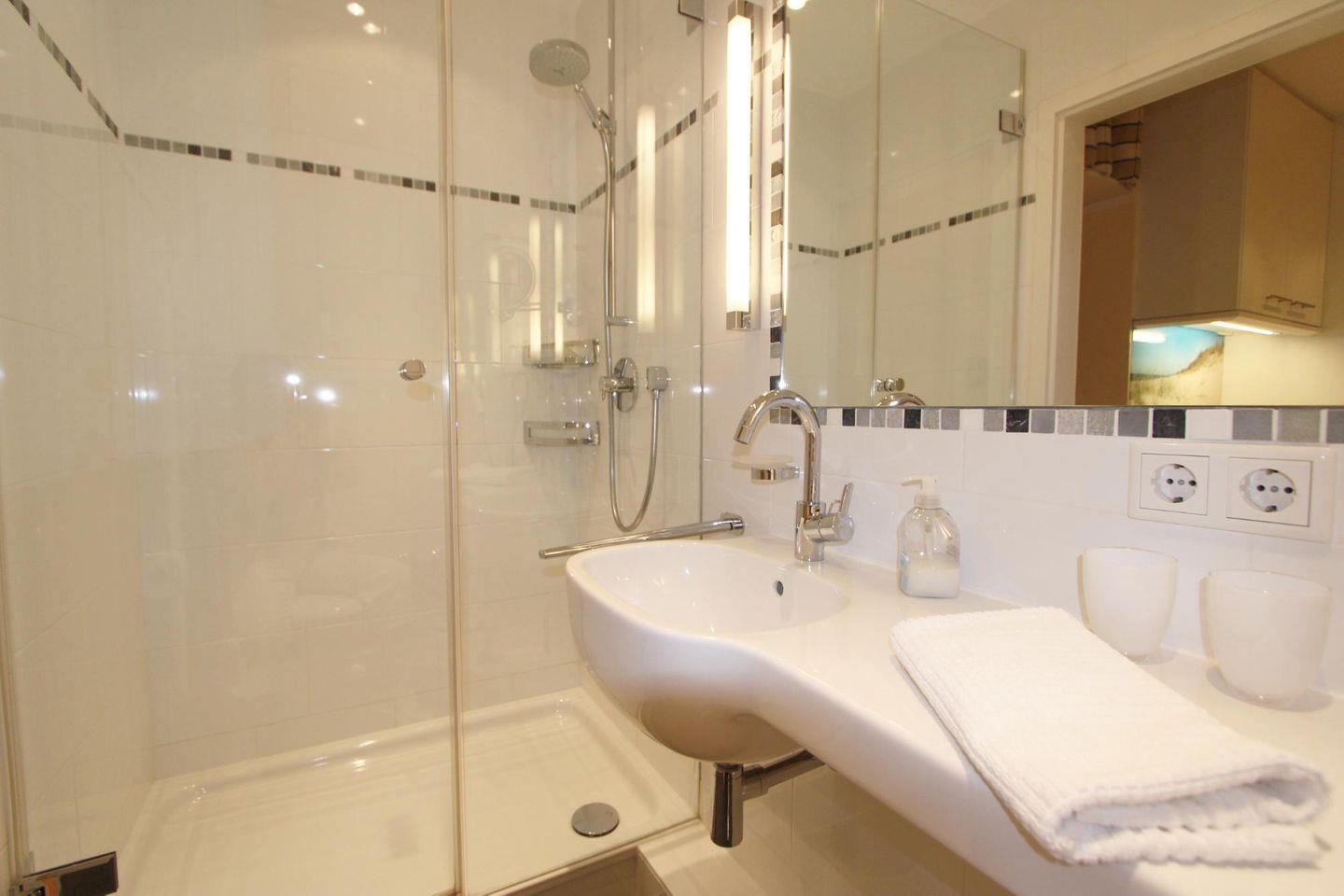 Im modernen, hellen Badezimmer genießen Sie vollen Komfort. Neben der Dusche nutzen Sie hier WC und Waschbecken mit beleuchtetem Kosmetikspiegel. Im Mieterkeller des Hauses stehen Waschmaschine und Trockner als Münzgeräte zur Verfügung.