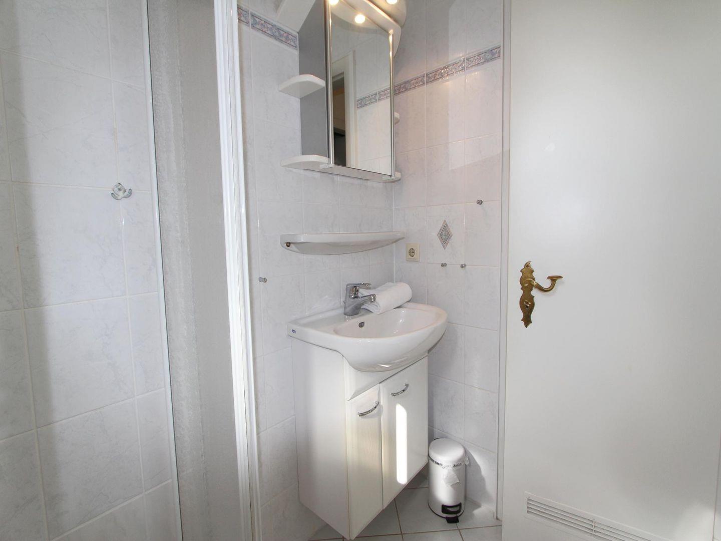 Im Bad nutzen Sie Toilette und eine Dusche mit Eck-Kabine. Das Fenster bietet die Möglichkeit zu lüften.