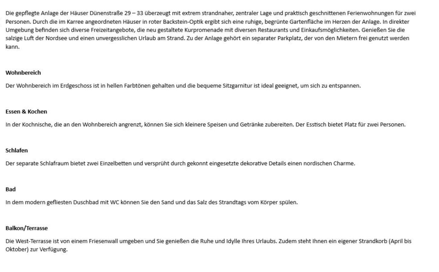 Die gepflegte Anlage der Häuser Dünenstraße 29 – 33 überzeugt mit extrem strandnaher, zentraler Lage und praktisch geschnittenen Ferienwohnungen für zwei Personen. Durch die im Karree angeordneten Häuser in roter Backstein-Optik ergibt sich eine ruhige, begrünte Gartenfläche im Herzen der Anlage. In direkter Umgebung befinden sich diverse Freizeitangebote, die neu gestaltete Kurpromenade mit diversen Restaurants und Einkaufsmöglichkeiten. Genießen Sie die salzige Luft der Nordsee und einen unvergesslichen Urlaub am Strand. Zu der Anlage gehört ein separater Parkplatz, der von den Mietern frei genutzt werden kann.