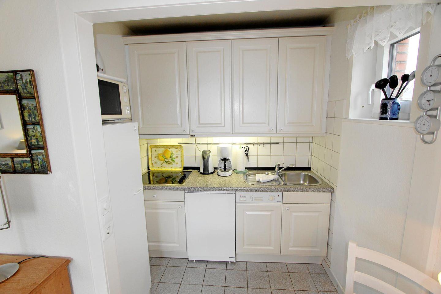 In der Kochnische, die an den Wohnbereich angrenzt, können Sie sich kleinere Speisen und Getränke zubereiten. Der Esstisch bietet Platz für zwei Personen.