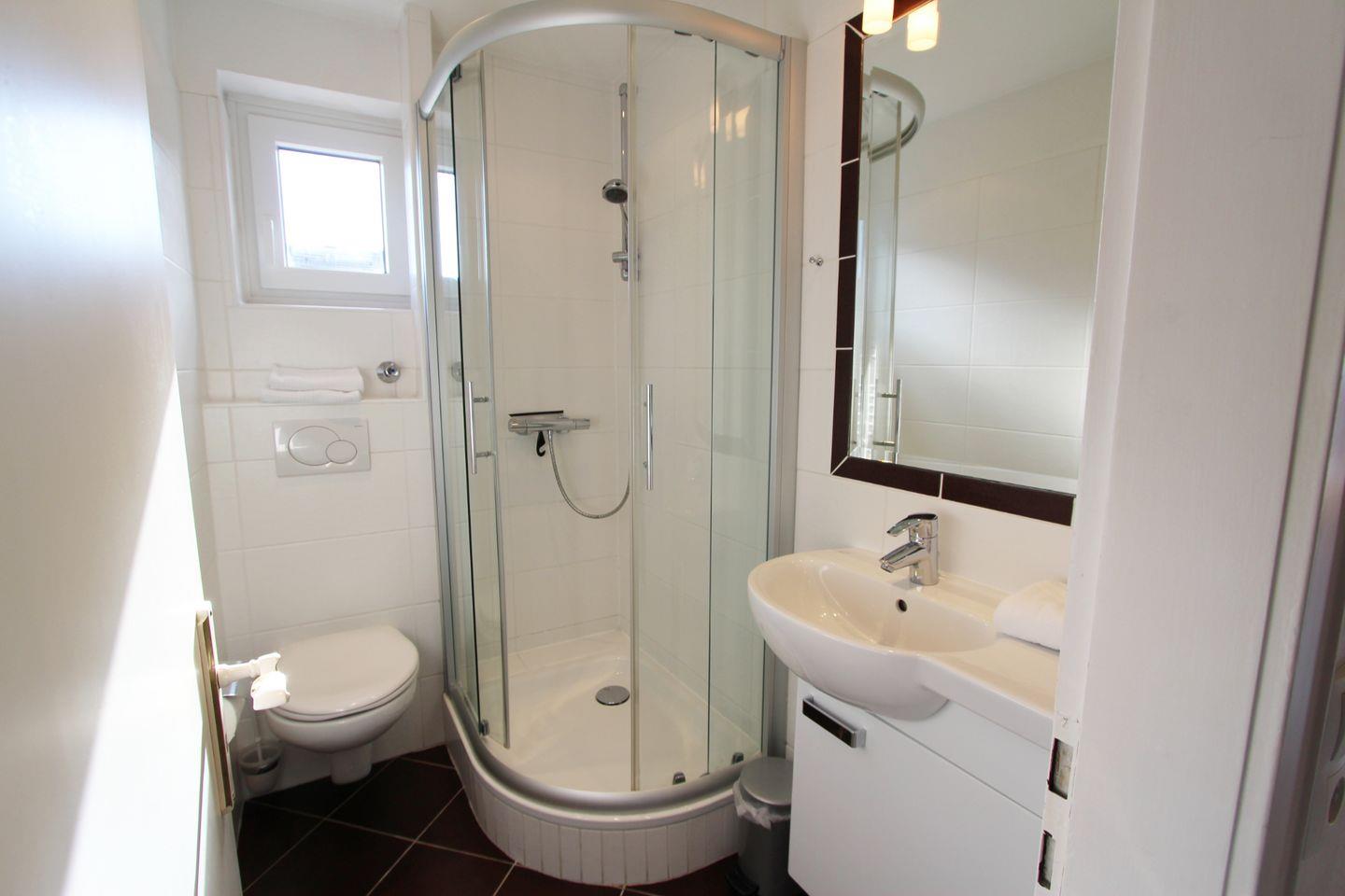In dem modern gefliesten Duschbad mit WC können Sie den Sand und das Salz des Strandtags vom Körper spülen.