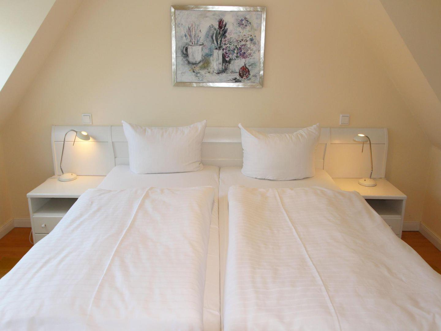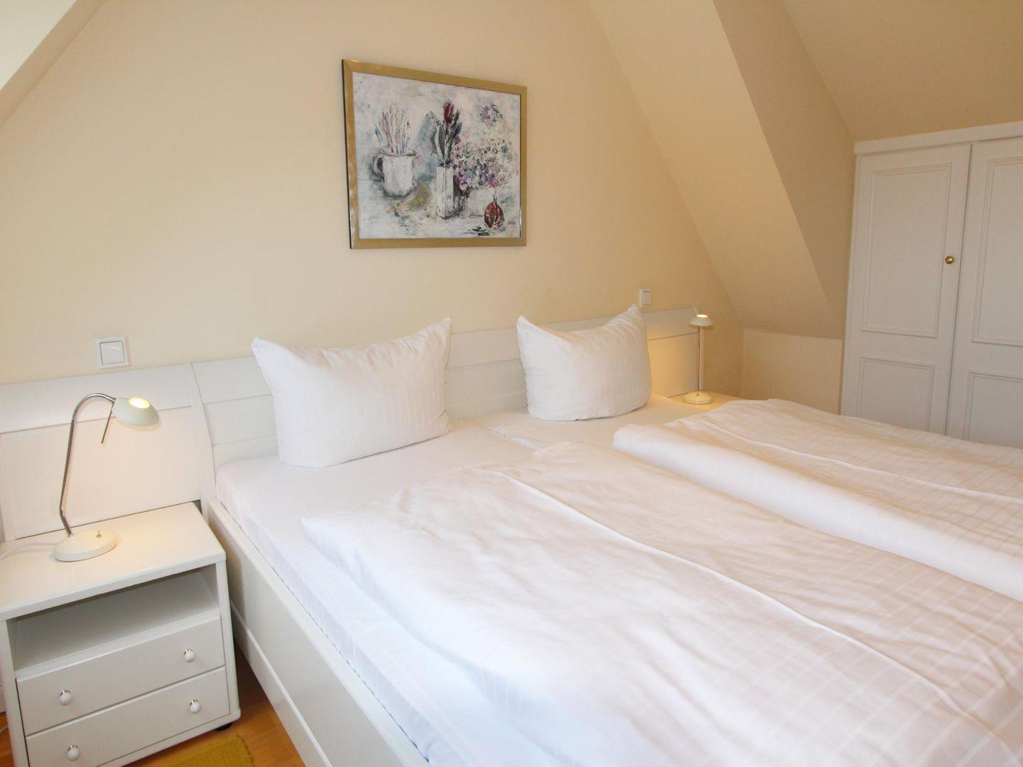 Ferner verfügt das Appartement 5 über zwei separate Schlafräume. Der Einzelschlafraum liegt auf einer Ebene mit dem Wohnbereich und ist attraktiv in hellen Tönen gestaltet. Das Doppelschlafzimmer finden Sie im Dachgeschoss.