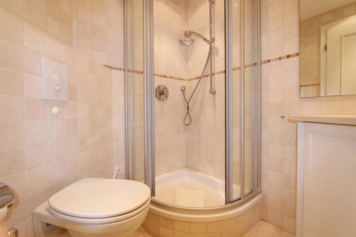 Im Badezimmer auf der Wohnebene stehen Ihnen moderne Dusche und WC zur Verfügung. Die hellen Fliesen verleihen dem Bad einen edlen Touch.