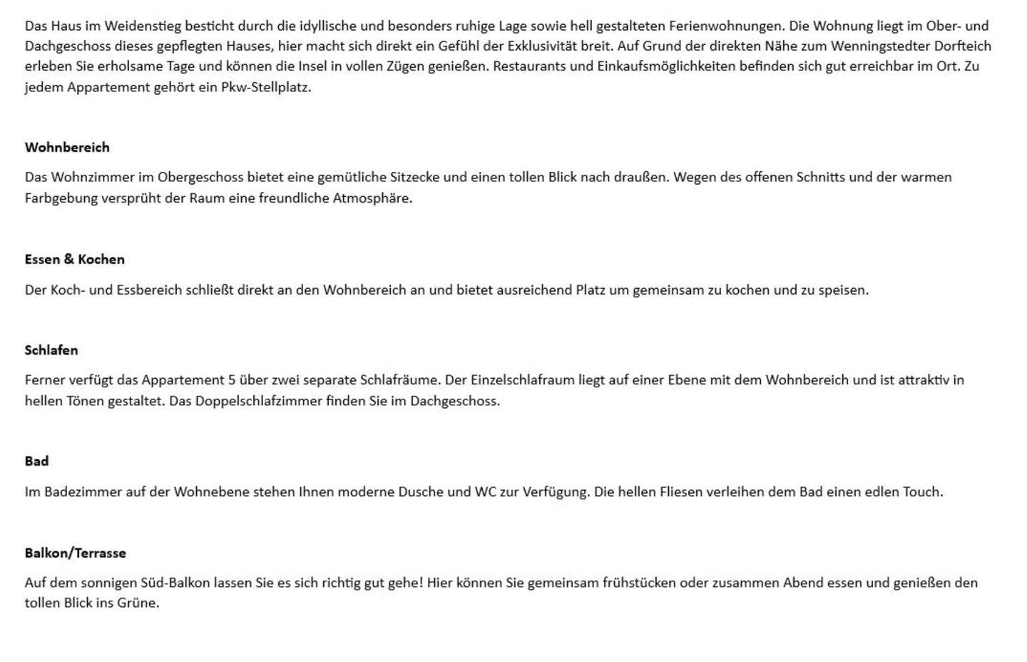 Das Haus im Weidenstieg besticht durch die idyllische und besonders ruhige Lage sowie hell gestalteten Ferienwohnungen. Durch das gepflegte Erscheinungsbild des Hauses macht sich direkt ein Gefühl der Exklusivität breit. Auf Grund der direkten Nähe zum Wenningstedter Dorfteich erleben Sie erholsame Tage und können die Insel in vollen Zügen genießen. Restaurants und Einkaufsmöglichkeiten befinden sich gut erreichbar im Ort. Zu jedem Appartement gehört ein Pkw-Stellplatz.