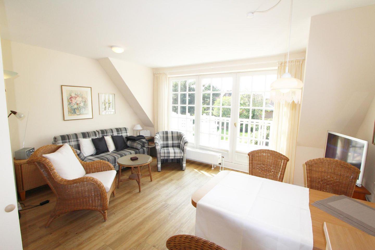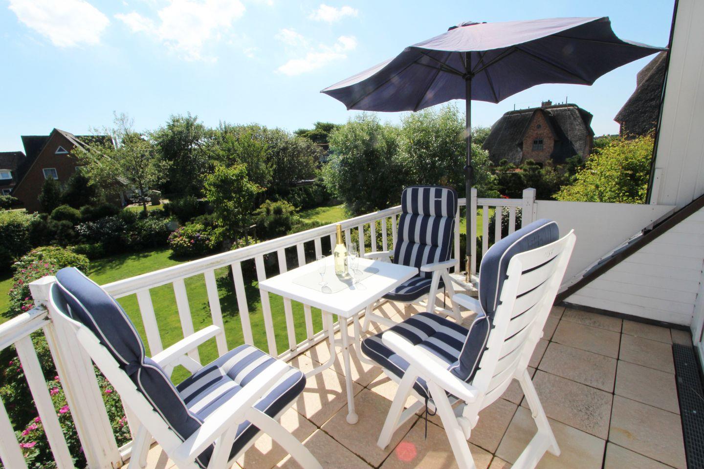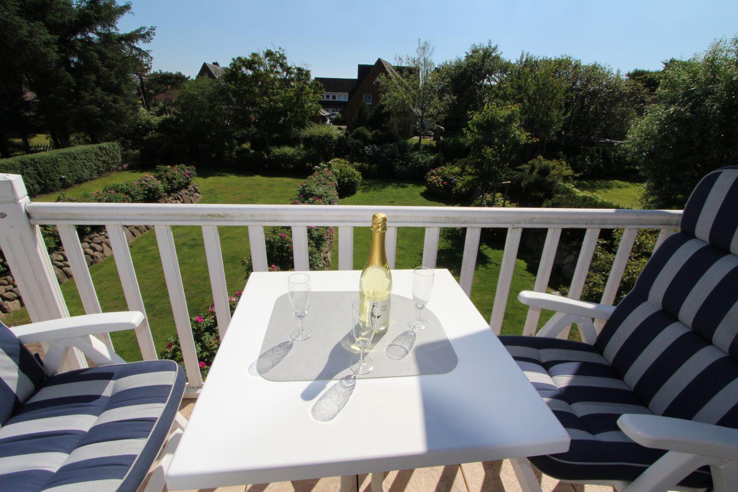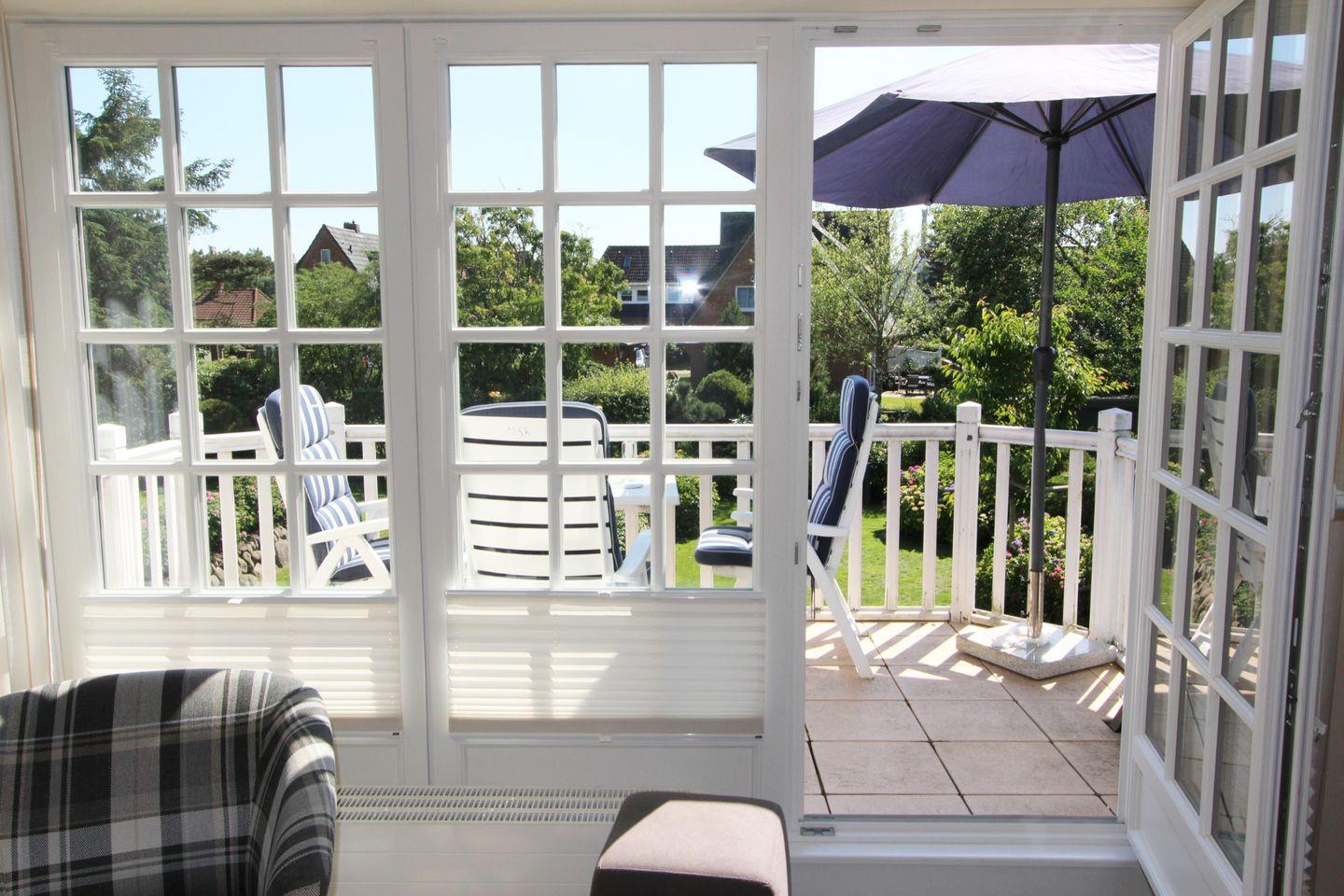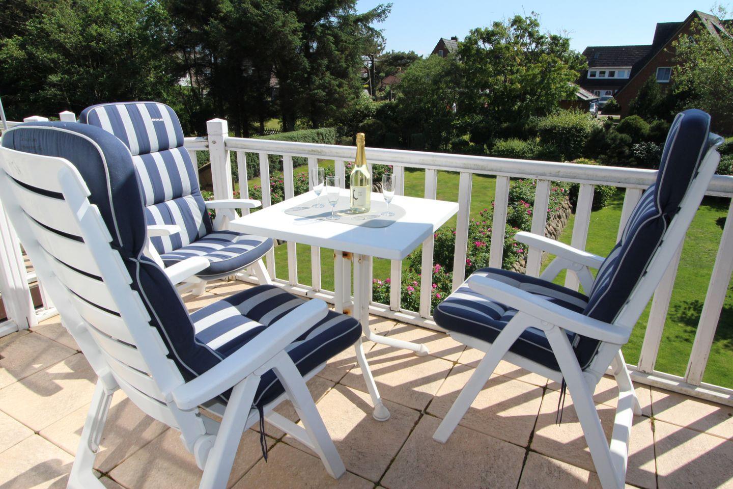 Auf dem einmalig schön gelegenen Süd-Balkon genießen Sie die erfrischende Luft der Nordsee. Der herrliche Blick ins Grüne sorgt für die perfekte Erholung.