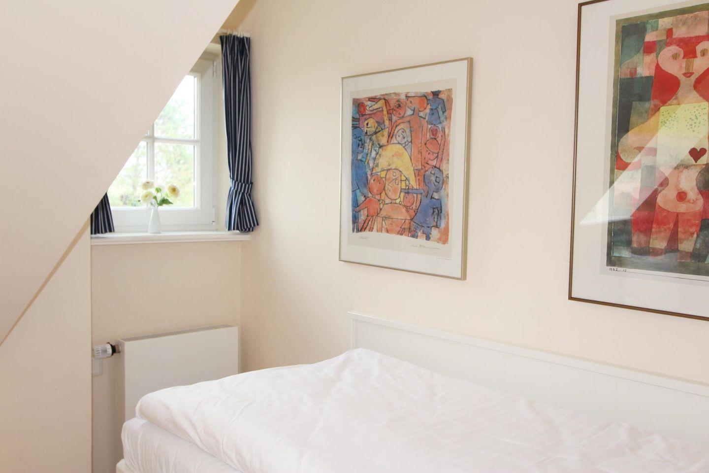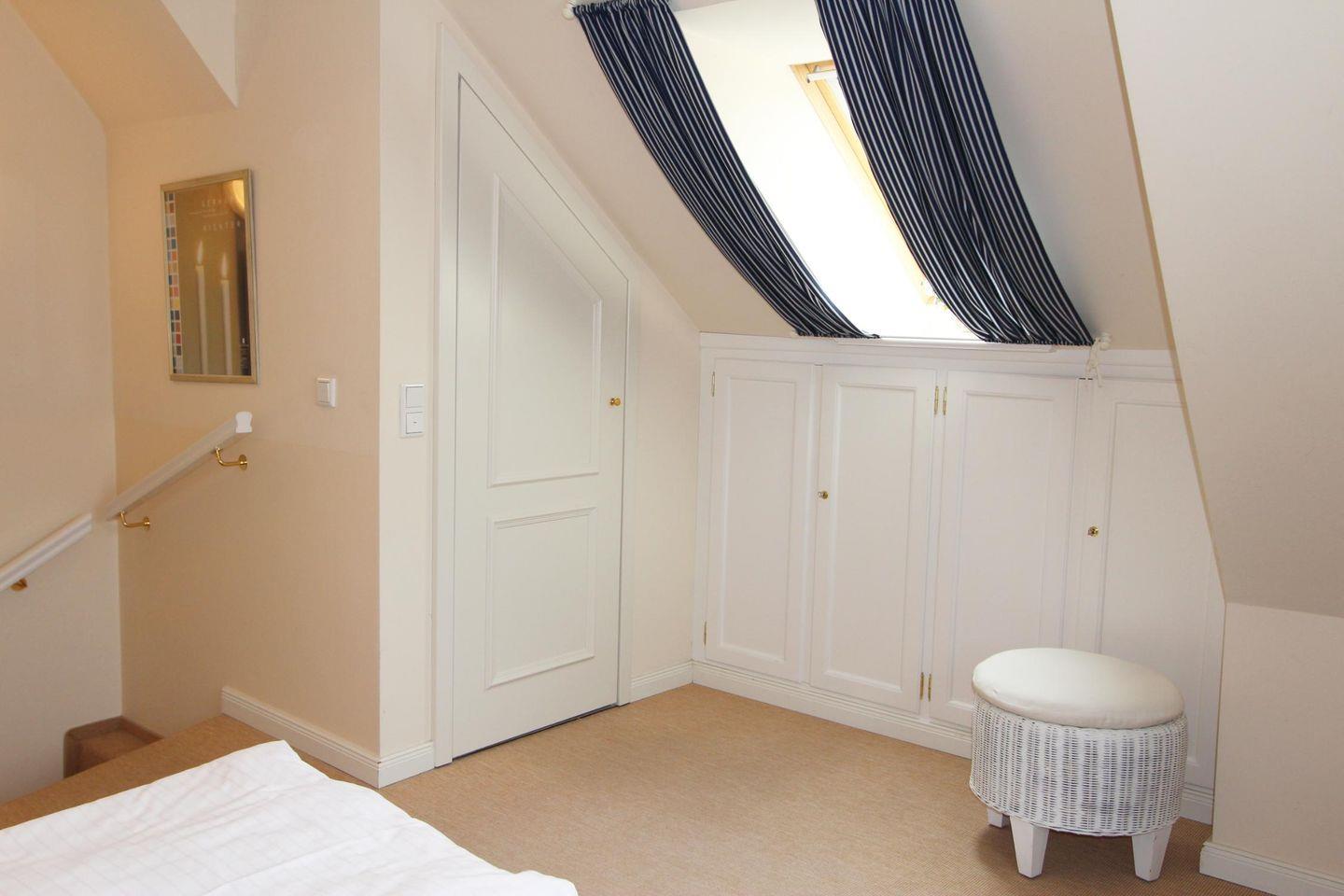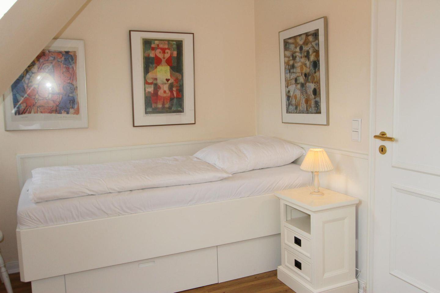 Ihnen stehen in diesem Ferienappartement zwei separate Schlafräume zur Verfügung. Der Einzelschlafraum im Obergeschoss bietet ein komfortables Einbaubett. Der Doppelschlafraum im Dachgeschoss ist schön hell eingerichtet und eignet sich bestens, um zur Ruhe zu kommen.