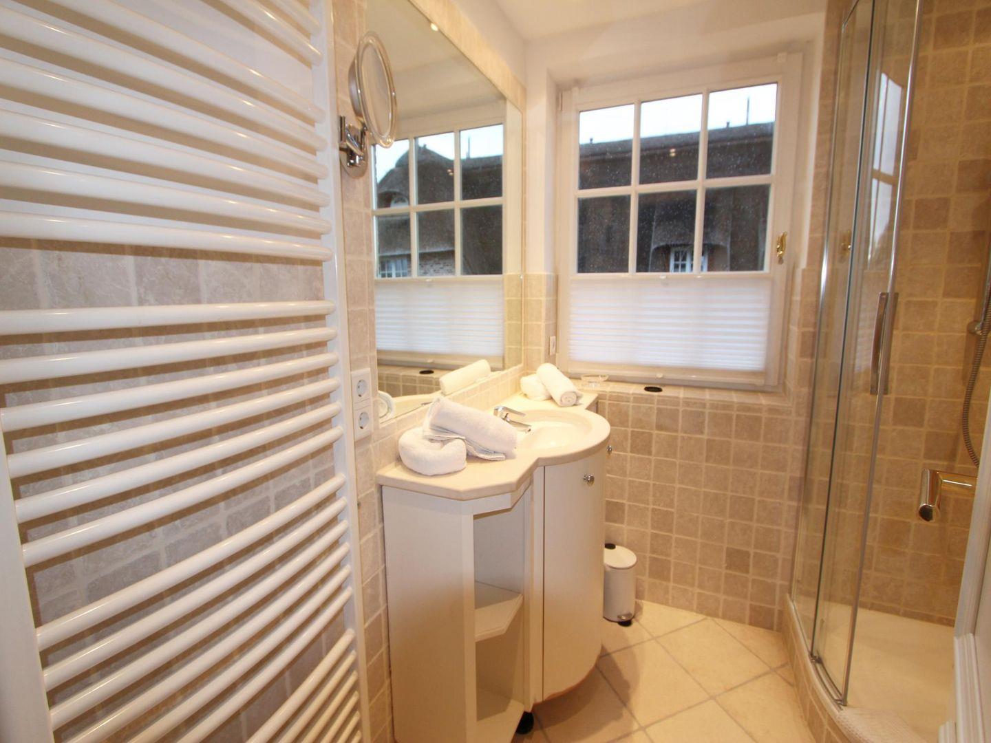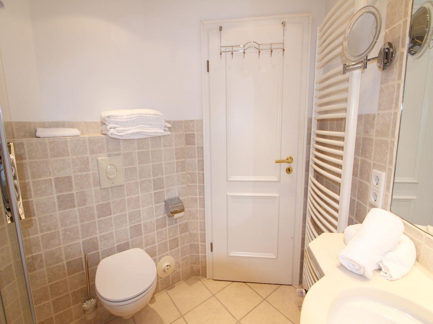 Das Badezimmer auf der Wohnebene mit seinen beige-farbenden Fliesen verfügt über eine Glas-Dusche und ein WC. Zudem können Sie in dieser Wohnung Waschmaschine und Trockner kostenfrei nutzen.