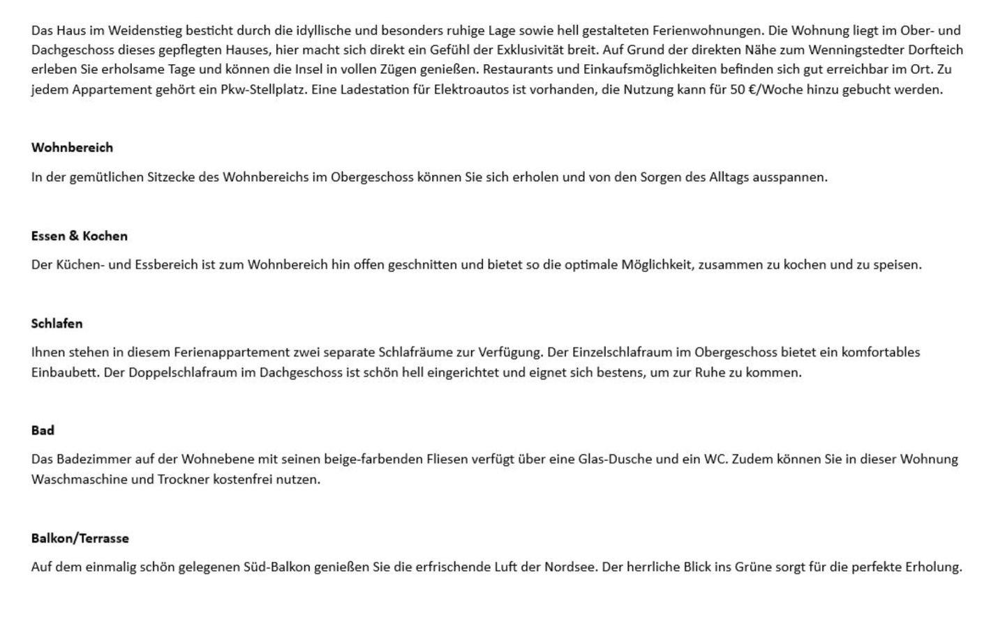 Das Haus im Weidenstieg besticht durch die idyllische und besonders ruhige Lage sowie hell gestalteten Ferienwohnungen. Durch das gepflegte Erscheinungsbild des Hauses macht sich direkt ein Gefühl der Exklusivität breit. Auf Grund der direkten Nähe zum Wenningstedter Dorfteich erleben Sie erholsame Tage und können die Insel in vollen Zügen genießen. Restaurants und Einkaufsmöglichkeiten befinden sich gut erreichbar im Ort. Zu jedem Appartement gehört ein Pkw-Stellplatz. Eine Ladestation für Elektroautos ist vorhanden, die Nutzung kann für 50 €/Woche hinzu gebucht werden.