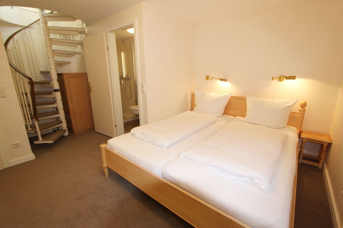Der Schlafraum befindet sich im Untergeschoss und bietet ein bequemes Doppelbett. Dieses ist über das Fußende zugänglich. Hinweis: Die Wendeltreppe ins Untergeschoss ist sehr eng!
