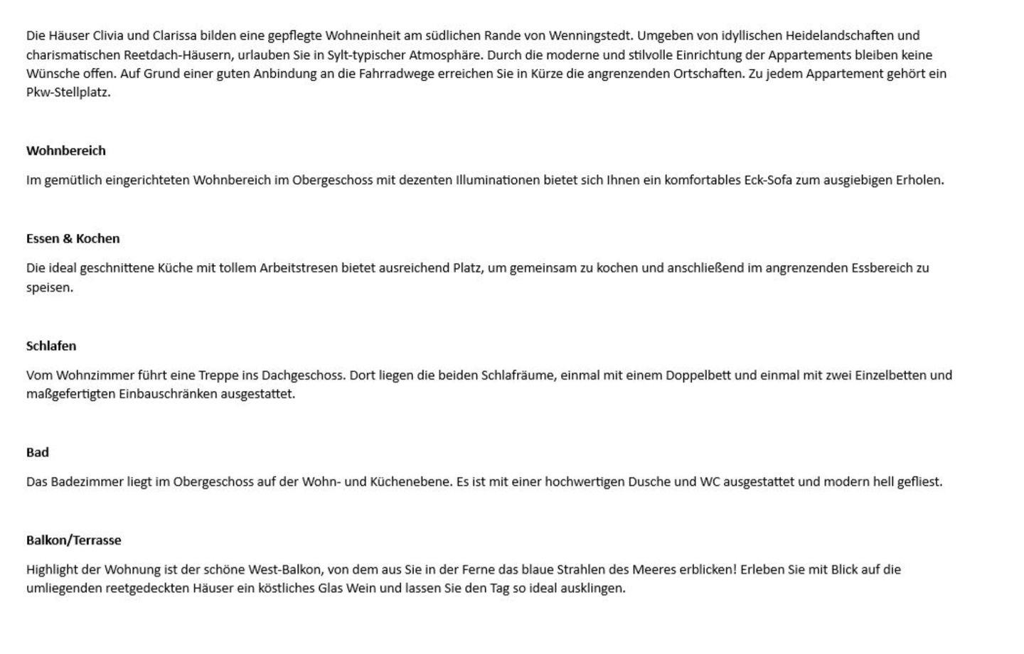 Die Häuser Clivia und Clarissa bilden eine gepflegte Wohneinheit am südlichen Rande von Wenningstedt. Umgeben von idyllischen Heidelandschaften und charismatischen Reetdach-Häusern, urlauben Sie in Sylt-typischer Atmosphäre. Durch die moderne und stilvolle Einrichtung der Appartements bleiben keine Wünsche offen. Auf Grund einer guten Anbindung an die Fahrradwege erreichen Sie in Kürze die angrenzenden Ortschaften. Zu jedem Appartement gehört ein Pkw-Stellplatz.