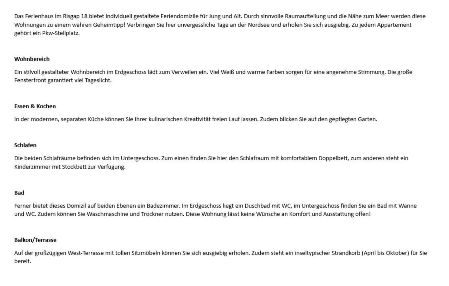 Das Ferienhaus im Risgap 18 bietet individuell gestaltete Feriendomizile für Jung und Alt. Durch sinnvolle Raumaufteilung und die Nähe zum Meer werden diese Wohnungen zu einem wahren Geheimtipp! Verbringen Sie hier unvergessliche Tage an der Nordsee und erholen Sie sich ausgiebig. Zu jedem Appartement gehört ein Pkw-Stellplatz.