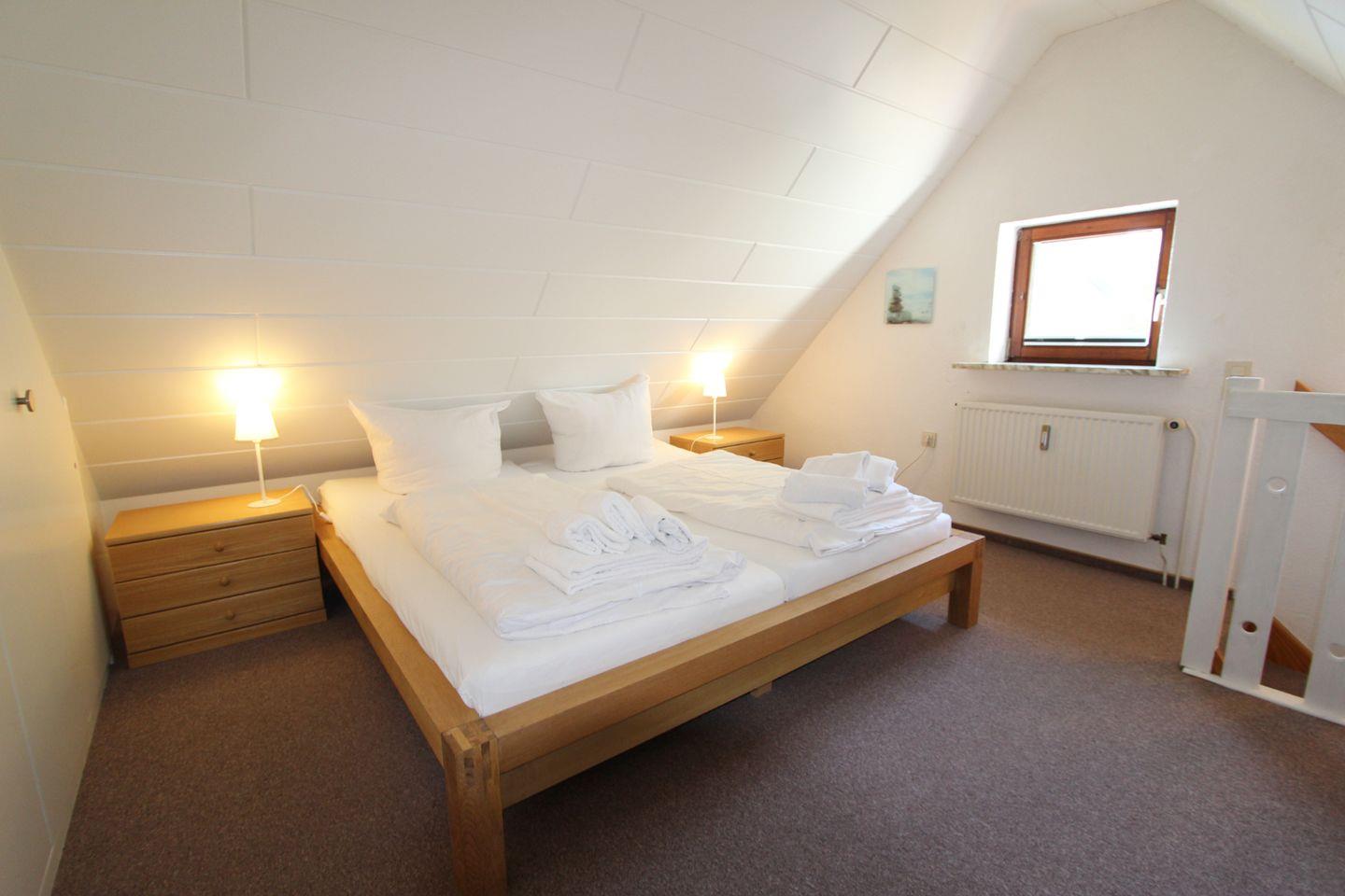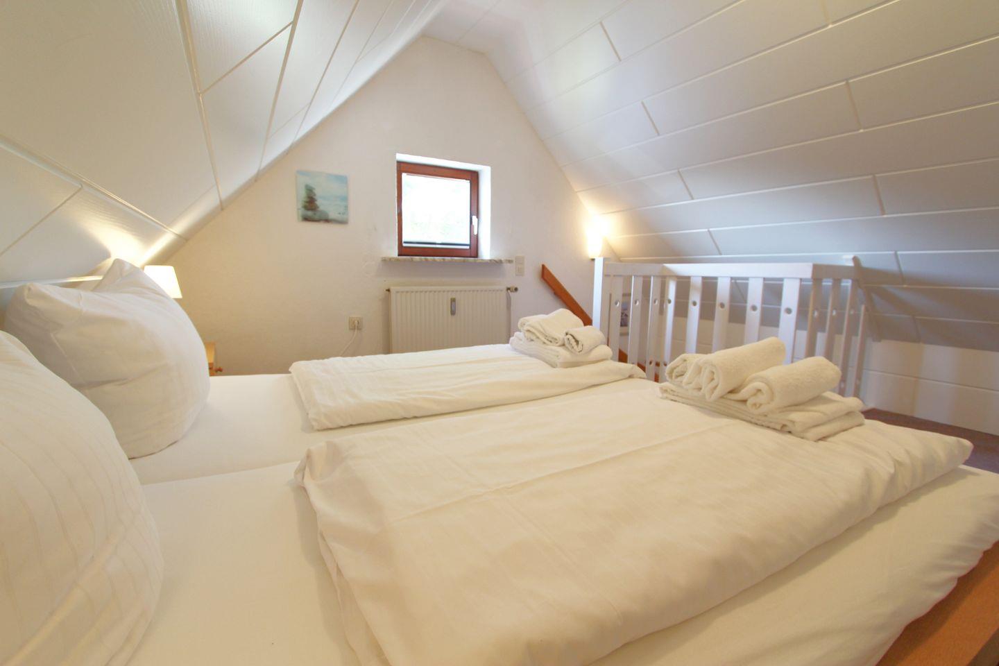 Im Obergeschoss, auf der Wohnebene, befindet sich der Einzelschlafraum mit Zugang zum Balkon. Des Weiteren finden Sie im Dachgeschoss ein Schlafzimmer mit komfortablem Doppelbett und geräumigen Einbau-Schränken.