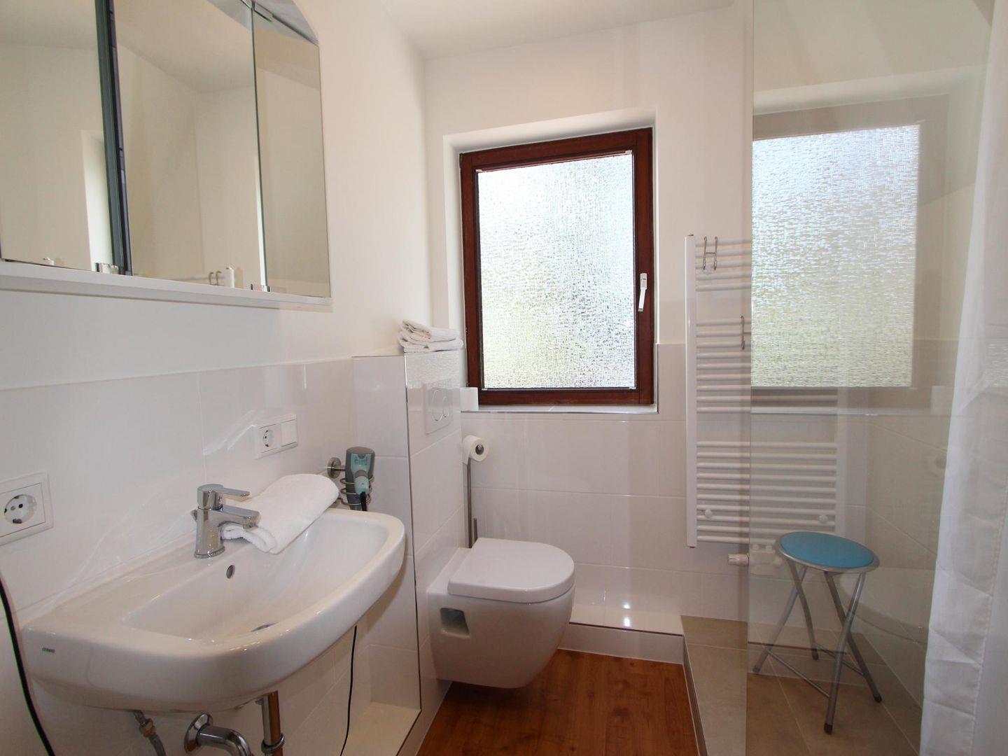 Sie nutzen ein helles und modernisiertes Duschbad mit WC. Waschmaschine und Trockner befinden sich als Münzgeräte im Keller des Hauses.