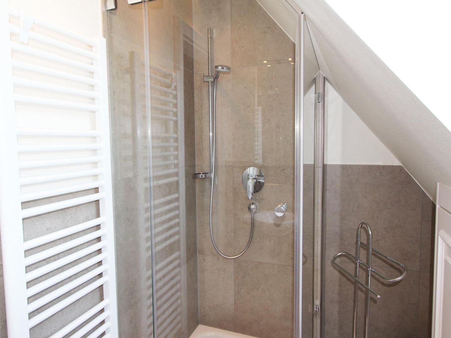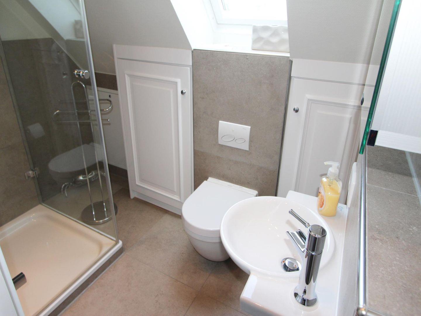 Das Ferienwohnung bietet auf beiden Ebenen je ein Duschbad mit WC in modernem Stil. Beide Duschbäder bestechen durch geschmackvolle Farbgebung und edle Glas-Duschkabinen.