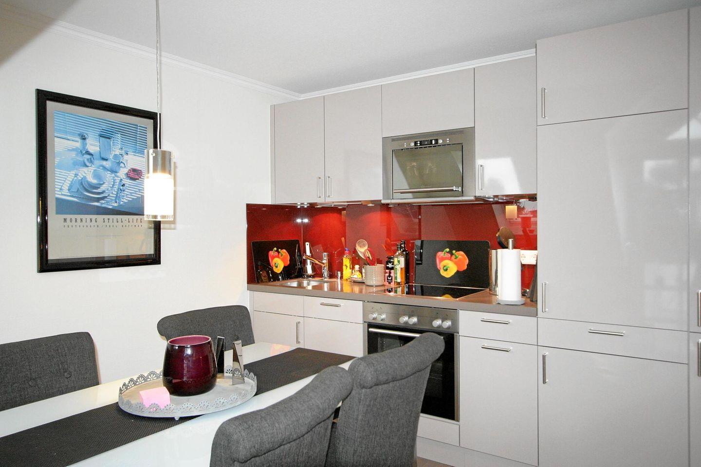 In dem zum Wohnbereich hin offenen Koch-Essbereich können Sie Ihrer kulinarischen Kreativität freien Lauf lassen. Die Einbau-Küche ist dafür umfassend ausgestattet.