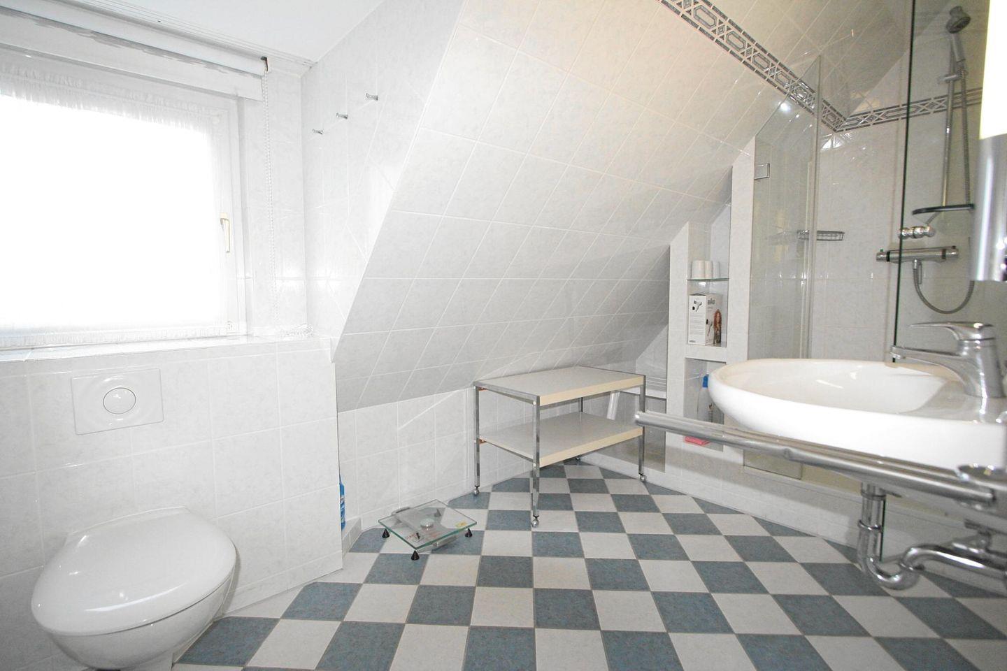 Im Badezimmer nutzen Sie Dusche und WC. Auf Grund der stilvollen Schachbrett-Musterung der Bodenfliesen genießen Sie den modernen Charme und können sich für den Urlaubstag erfrischen. Eine Waschmaschine steht als Münzgerät im Mieterkeller zur Verfügung.