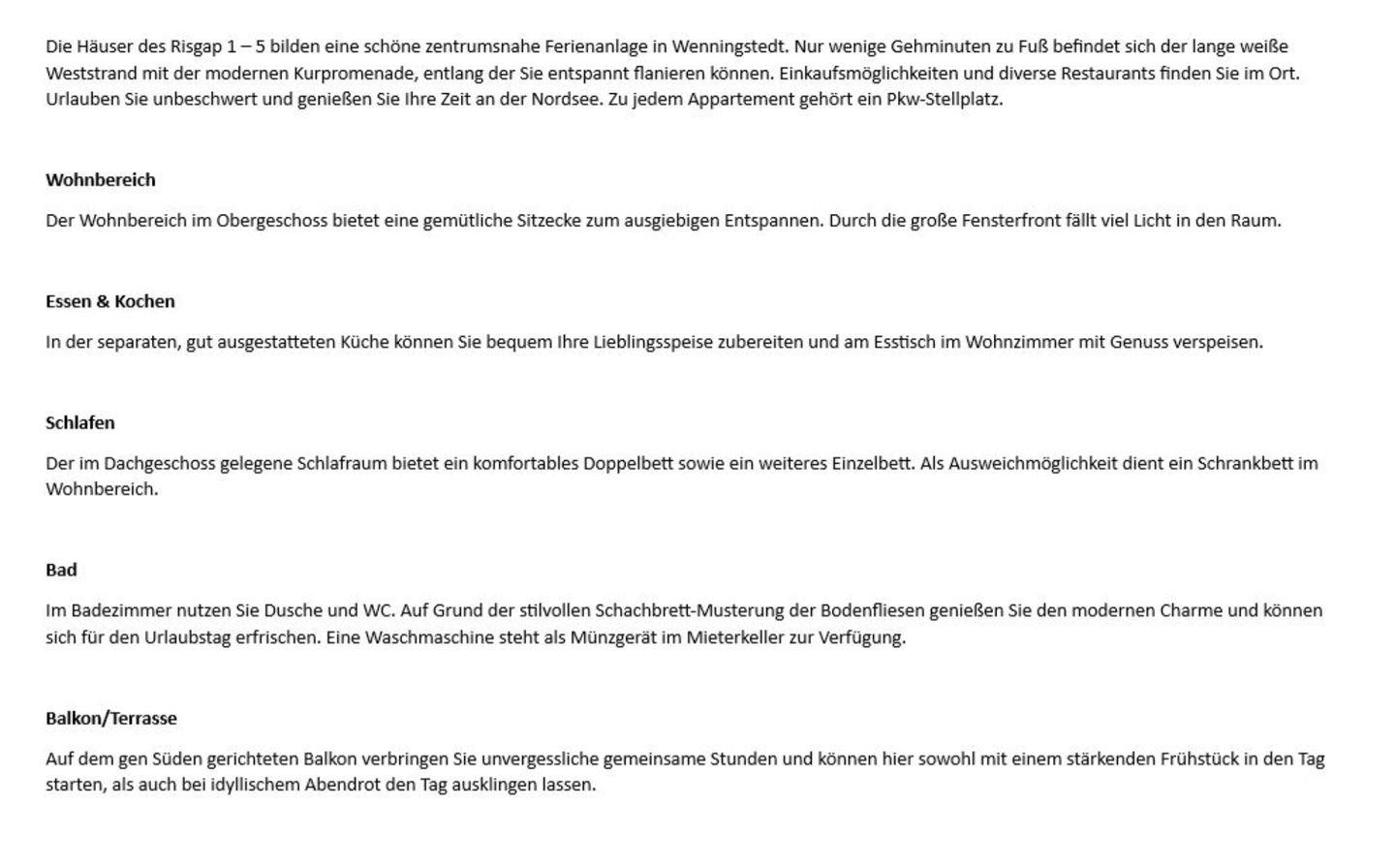 Die Häuser des Risgap 1 – 5 bilden eine schöne zentrumsnahe Ferienanlage in Wenningstedt. Nur wenige Gehminuten zu Fuß befindet sich der lange weiße Weststrand mit der modernen Kurpromenade, entlang der Sie entspannt flanieren können. Einkaufsmöglichkeiten und diverse Restaurants finden Sie im Ort. Urlauben Sie unbeschwert und genießen Sie Ihre Zeit an der Nordsee. Zu jedem Appartement gehört ein Pkw-Stellplatz.