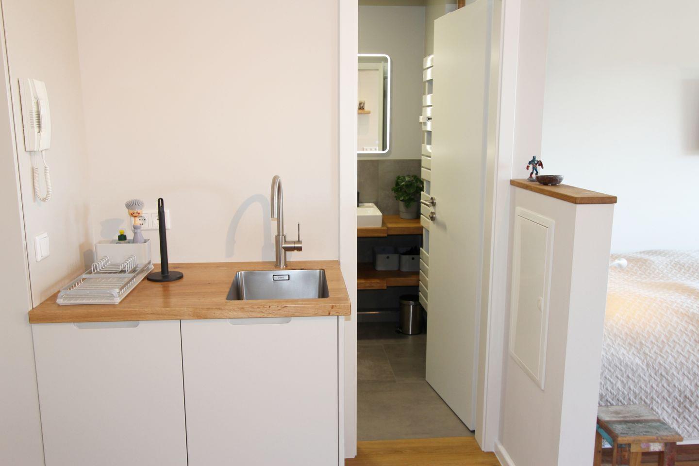 Die eingebaute Küchenzeile ist gut ausgestattet und bietet Ihnen viele Möglichkeiten, gemütlich zu zweit zu kochen und den Sylt-Urlaub kulinarisch zu genießen. Am Küchentresen finden zwei Personen Platz.