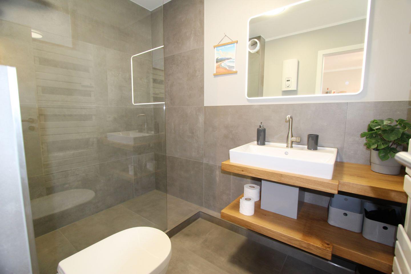In dieser Ferienwohnung finden Sie ein Badezimmer mit großer Dusche und WC vor. Waschmaschine und Trockner finden Sie als Münzgeräte für die allgemeine Nutzung im Haus.