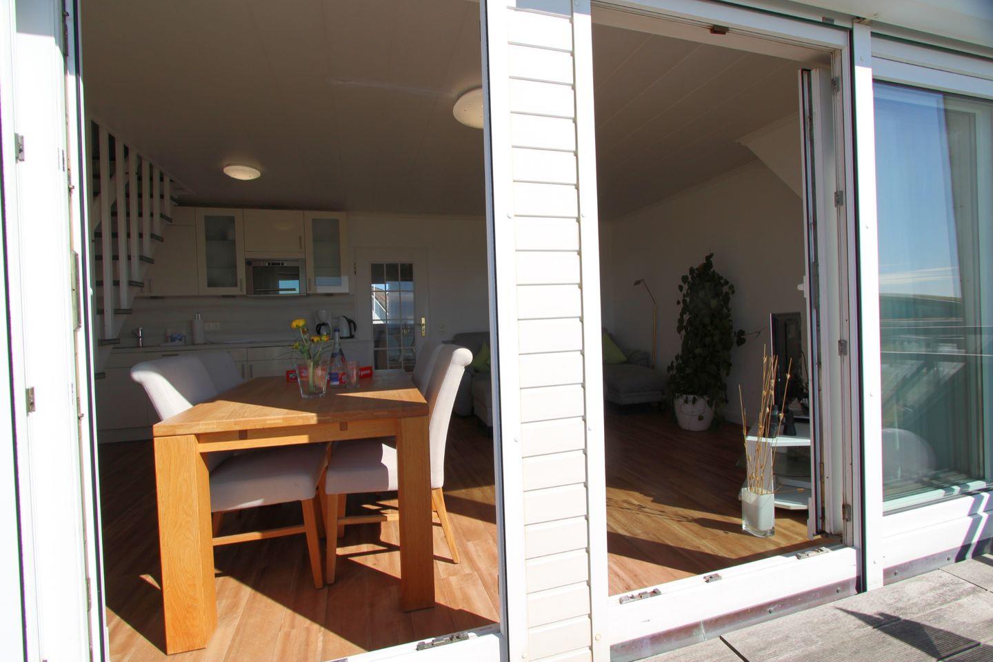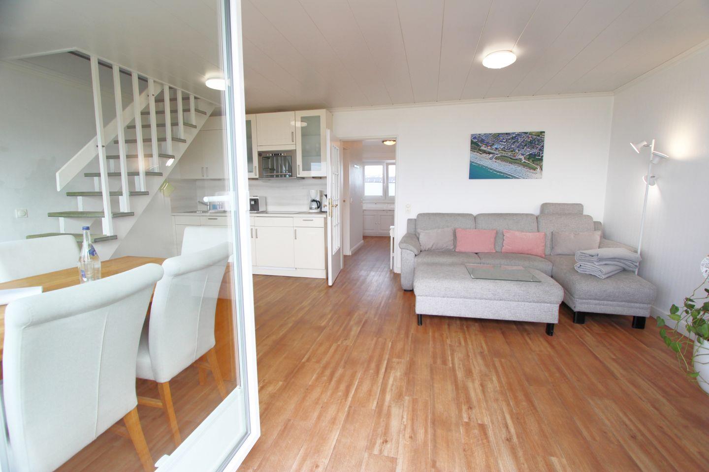 Der gemütliche Wohnbereich im Obergeschoss lädt mit einer hochwertigen, bequemen Sitzecke zu Entspannung und Erholung ein. Highlight des Wohnbereiches ist der direkte Meerblick!