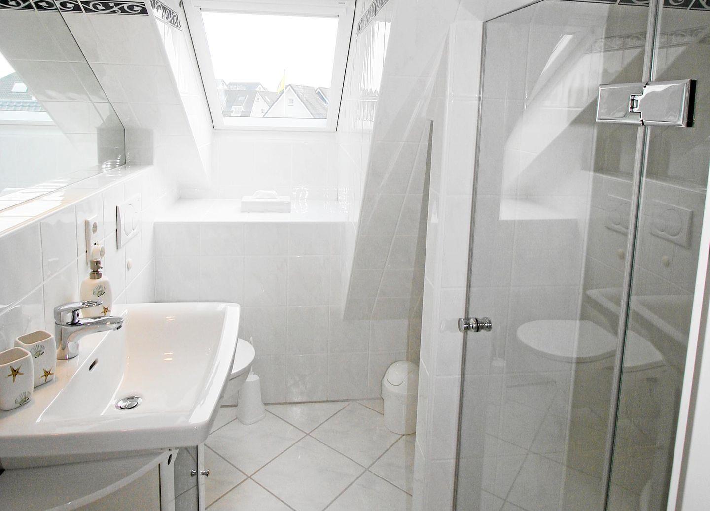 Auf beiden Etagen befindet sich jeweils ein Duschbad mit WC. Badezimmer 1 mit WC und Dusche befindet sich im Obergeschoss und bietet neben einer hellen, freundlichen Optik ein Doppelwaschbecken. Badezimmer 2 mit WC und Dusche liegt Dachgeschoss und grenzt direkt an den Schlafraum an. Ferner stehen Ihnen eine Sauna, eine Waschmaschine und ein Trockner gegen Gebühr im Nebenhaus zur Verfügung.