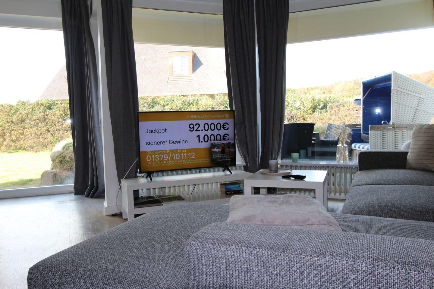 Im großzügigen Wohnbereich im Erdgeschoss entspannen Sie auf der bequemen Sofagarnitur mit Blick auf die gepflegte Rasenfläche.