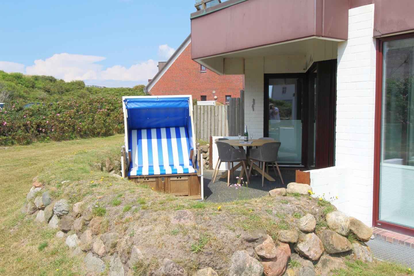 Auf der sonnigen Süd-West-Terrasse können Sie schon in den Morgenstunden ein kräftigendes Frühstück zu sich nehmen und dabei dem Rauschen des Meeres lauschen. Ein Strandkorb steht in der Saison (April bis Oktober) bereit. Erleben Sie Sylt-Urlaub von seiner schönsten Seite!