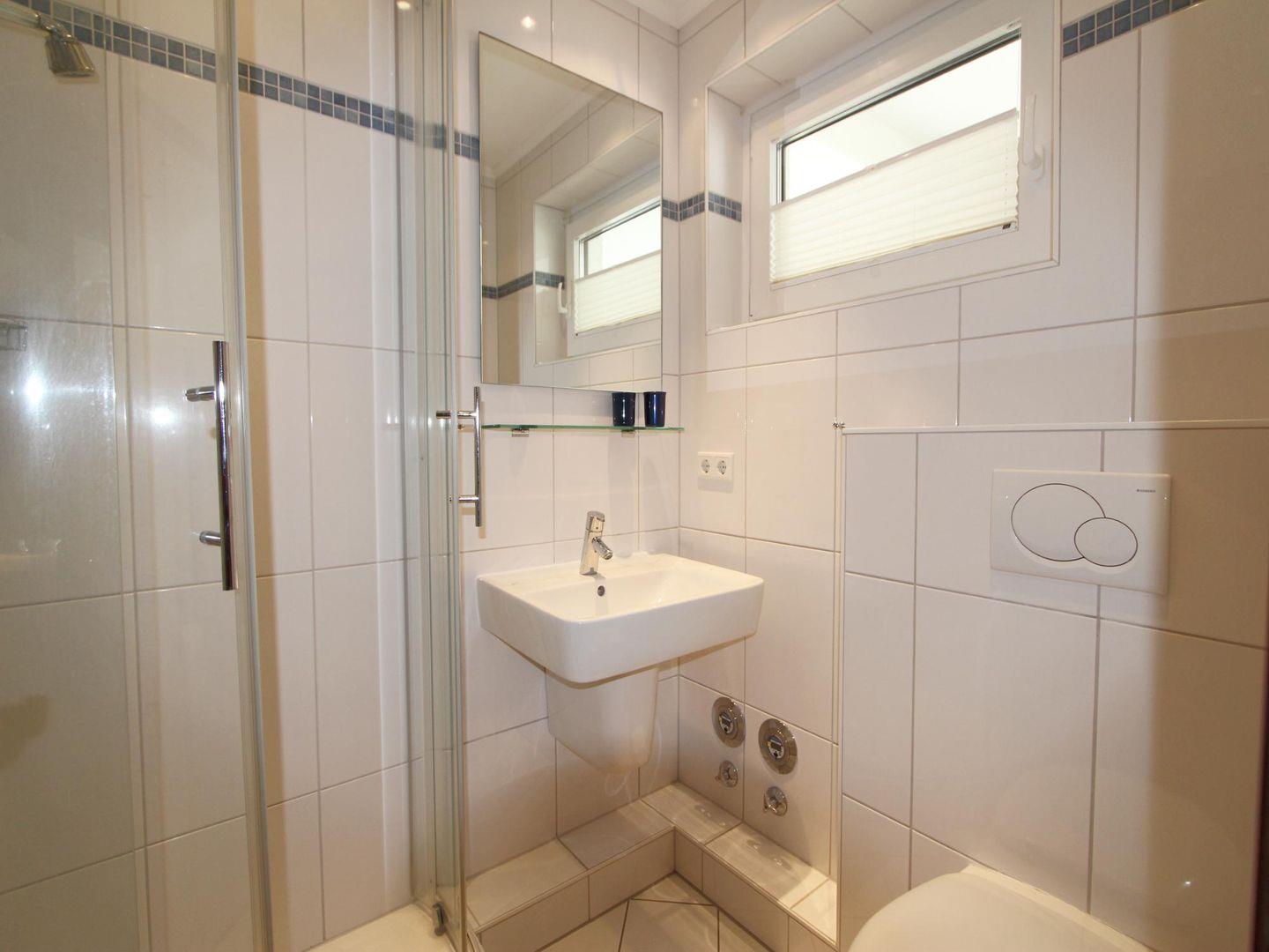 Das Badezimmer verfügt über Dusche mit Glas-Kabine und WC. Außerdem stehen Ihnen eine Münz-Waschmaschine und ein Münz-Trockner im Mieterkeller zur Verfügung.